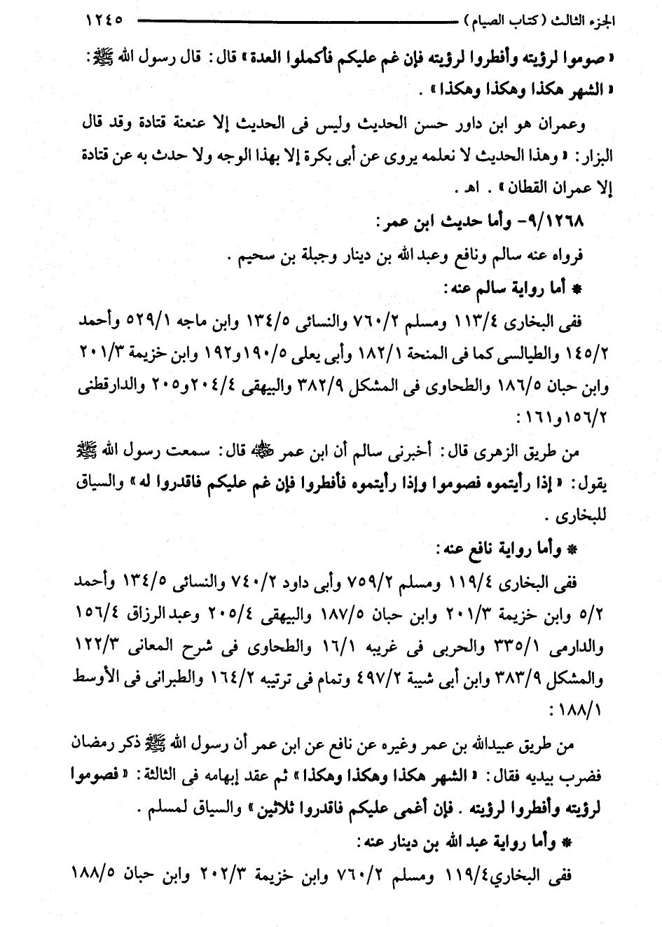 ففي البخاري 4/ 113 ومسلم 2/ 760 والنسائي 5/ 134 وابن ماجه 1/ 529 وأحمد 2/ 145 والطيالسى كما في المنحة 1/ 182 وأبى يعلى 5/ 190 و 192 وابن خزيمة 3/ 201 وابن حبان 5/ 186 والطحاوى في المشكل 9/ 382 والبيهقي 4/ 204 و 205والدارقطني 2/ 156 و 161: