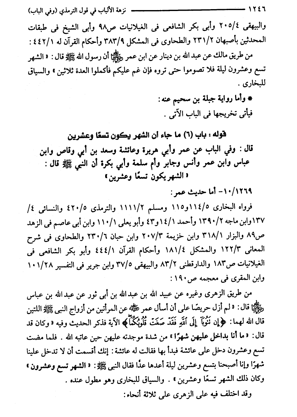 قال: وفي الباب عن عمر وأبي هريرة وعائشة وسعد بن أبي وقاص وابن عباس وابن عمر وأنس وجابر وأم سلمة وأبي بكرة أن النبي - صلى الله عليه وسلم - قال: "الشهر يكون تسعًا وعشرين"