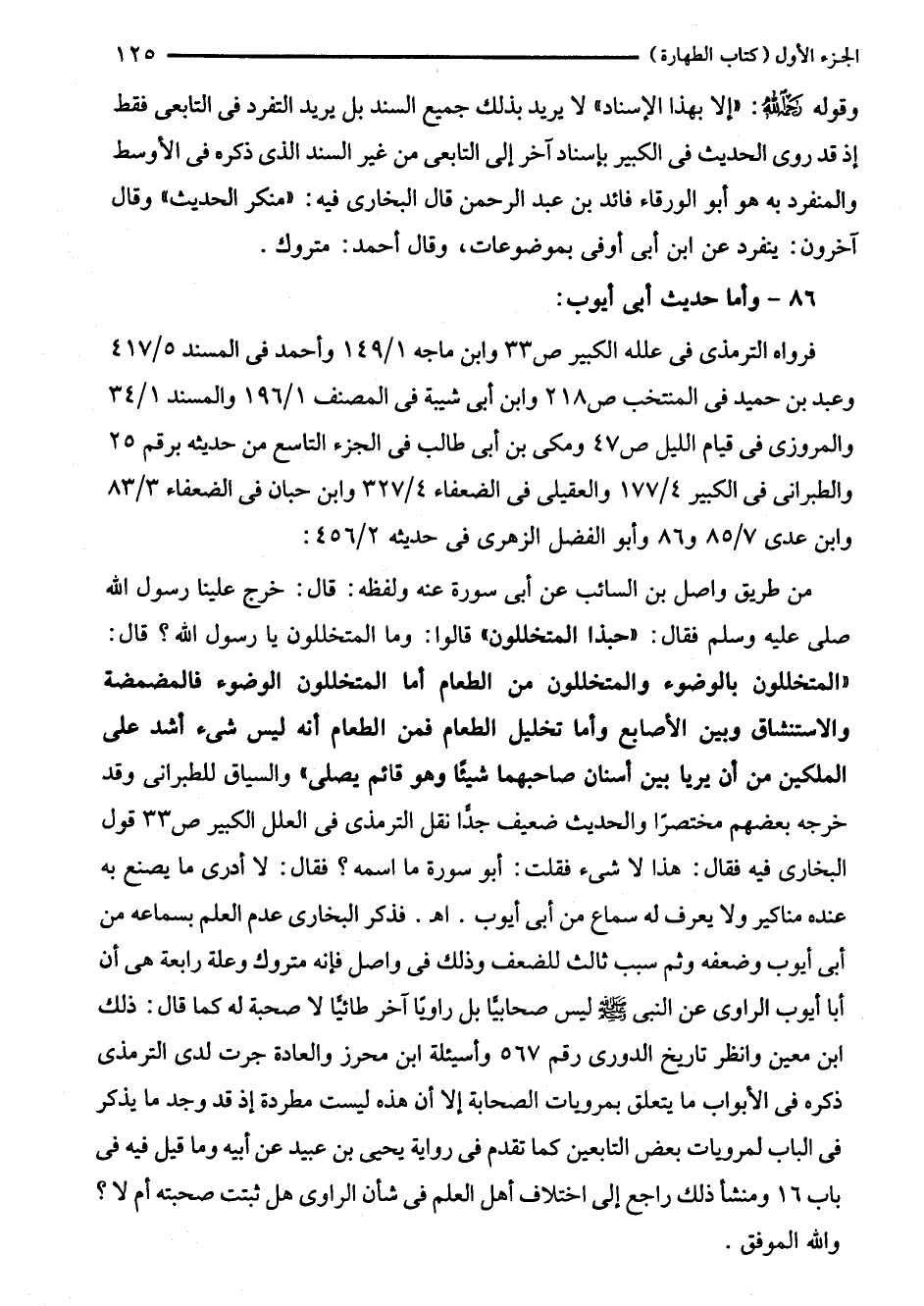 فرواه الترمذي في علله الكبير ص 33 وابن ماجه 1/ 149 وأحمد في المسند 5/ 417 وعبد بن حميد في المنتخب ص 218 وابن أبى شيبة في المصنف 1/ 196 والمسند 1/ 34 والمروزى في قيام الليل ص 47 ومكى بن أبى طالب في الجزء التاسع من حديثه برقم 25 والطبراني في الكبير 4/ 177 والعقيلى في الضعفاء 4/ 327 وابن حبان في الضعفاء 3/ 83 وابن على 7/ 85 و 86 وأبو الفضل الزهرى في حديثه 2/ 456: