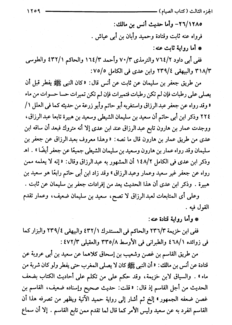 من طريق جعفر بن سليمان عن ثابت عن أنس قال: "كان النبي - صلى الله عليه وسلم - يفطر قبل أن يصلى على رطبات فإن لم تكن رطبات فتميرات فإن لم تكن تميرات حسا حسوات من ماء" وقد رواه عن جعفر عبد الرزاق واستغربه أبو حاتم وأبو زرعة من حديثه كما في العلل 1/ 224 وذكر ابن أبى حاتم أن سعيد بن سليمان الشيطى وسعيد بن هبيرة تابعا عبد الرزاق، ووجدت عمار بن هارون تابع عبد الرزاق عند ابن عدى إلا أنه متروك فبعد أن ساقه ابن عدى من طريق عمار بن هارون قال ما نصه: "وهذا معروف بعبد الرزاق عن جعفر بن سليمان وقد رواه عمار بن هارون وسعيد بن سليمان الشيطى جميعًا عن جعفر أيضًا". اهـ وذكر ابن عدى في الكامل 2/ 148 أن المشهور به عبد الرزاق وقال: "إنه لا يعلمه ممن رواه عن جعفر غير سعيد وعمار وعبد الرزاق" وقد زاد ابن أبى حاتم رابعًا هو سعيد بن هبيرة. وذكر ابن عدى أن هذا الحديث يعد من إفرادات جعفر بن سليمان عن ثابت.