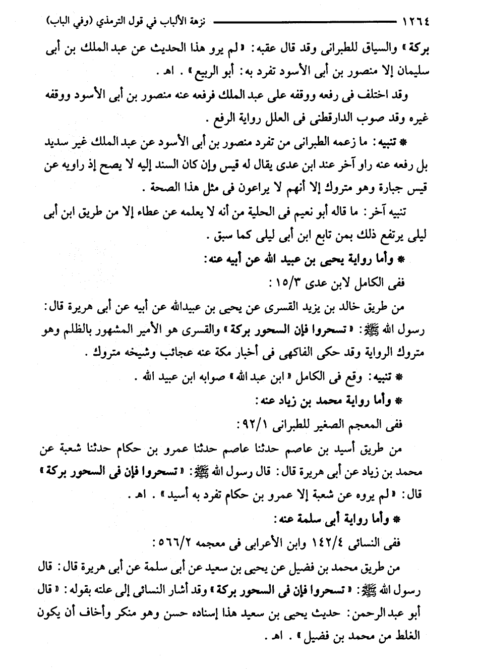 من طريق محمد بن فضيل عن يحيى بن سعيد عن أبى سلمة عن أبى هريرة قال: قال رسول الله - صلى الله عليه وسلم -: "تسحروا فإن في السحور بركة" وقد أشار النسائي إلى علته بقوله: "قال أبو عبد الرحمن: حديث يحيى بن سعيد هذا إسناده حسن وهو منكر وأخاف أن يكون الغلط من محمد بن فضيل". اهـ.