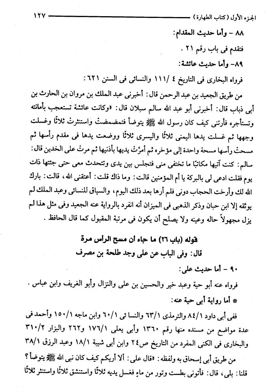 ففي أبى داود 1/ 84 والترمذي 1/ 63 والنسائي 1/ 61 وابن ماجه 1/ 150 وأحمد في عدة مواضع من مسنده منها رقم 1360 وأبى يعلى 1/ 176 و 262 والبزار 2/ 310 والبخاري في الكنى المفرد من التاريخ ص 24 وابن أبى شيبة 1/ 18 وعبد الرزق 1/ 38 من طريق أبى إسحاق به ولفظه: "قال على: ألا أريكم كيف كان نبى الله - صلى الله عليه وسلم - يتوضأ؟ قلنا: بلى، قال: فأتونى بطست وتور من ماءٍ فغسمل يديه ثلاثًا واستنشق ثلاثًا واستنثر ثلاثًا