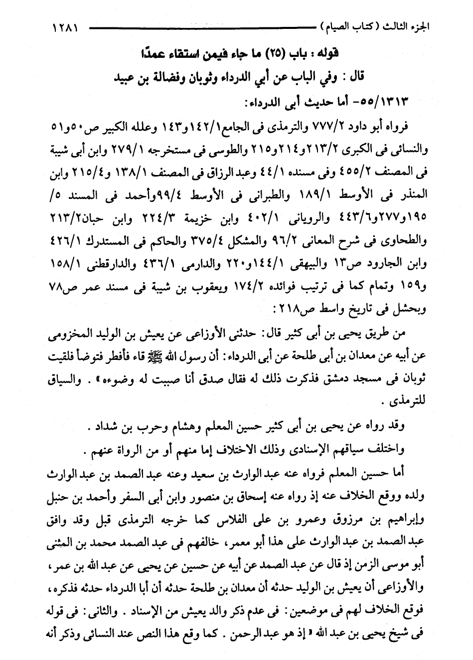 من طريق يحيى بن أبى كثير قال: حدثنى الأوزاعى عن يعيش بن الوليد المخزومى عن أبيه عن معدان بن أبى طلحة عن أبى الدرداء: أن رسول الله - صلى الله عليه وسلم - قاء فأفطر فتوضأ فلقيت ثوبان في مسجد دمشق فذكرت ذلك له فقال صدق أنا صببت له وضوءه". والسياق للترمذي.