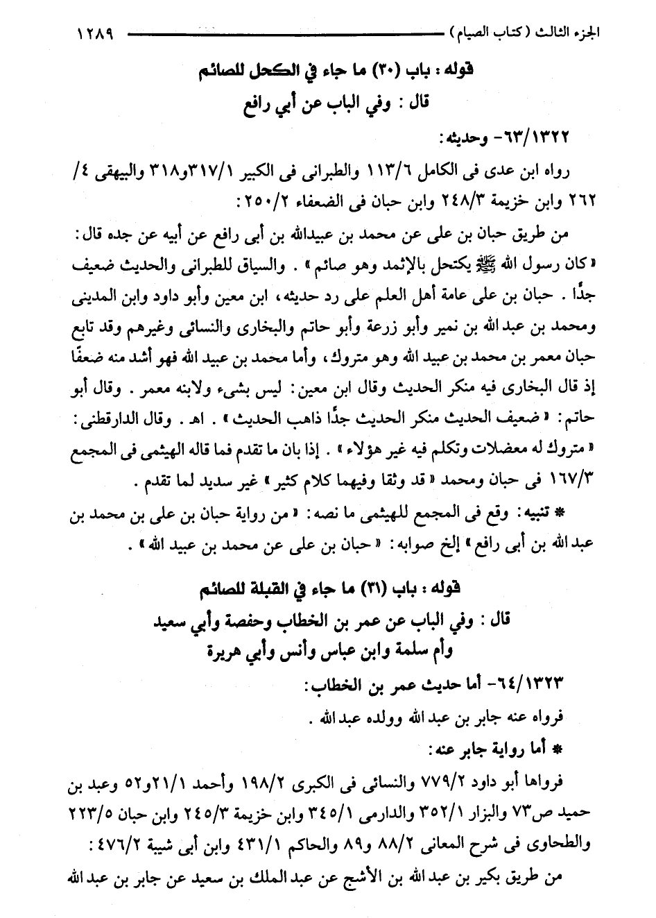 من طريق حبان بن على عن محمد بن عبيد الله بن أبى رافع عن أبيه عن جده قال: "كان رسول الله - صلى الله عليه وسلم - يكتحل بالإثمد وهو صائم". والسياق للطبراني والحديث ضعيف جدًّا. حبان بن على عامة أهل العلم على رد حديثه، ابن معين وأبو داود وابن المدينى ومحمد بن عبد الله بن نمير وأبو زرعة وأبو حاتم والبخاري والنسائي وغيرهم وقد تابع حبان معمر بن محمد بن عبيد الله وهو متروك، وأما محمد بن عبيد الله فهو أشد منه ضعفًا إذ قال البخاري فيه منكر الحديث وقال ابن معين: ليس بشىء ولابنه معمر. وقال أبو حاتم: "ضعيف الحديث منكر الحديث جدًّا ذاهب الحديث". اهـ. وقال الدارقطني: "متروك له معضلات وتكلم فيه غير هؤلاء". إذا بأن ما تقدم فما قاله الهيثمى في المجمع 3/ 167 في حبان ومحمد "قد وثقا وفيهما كلام كثير" غير سديد لما تقدم.
