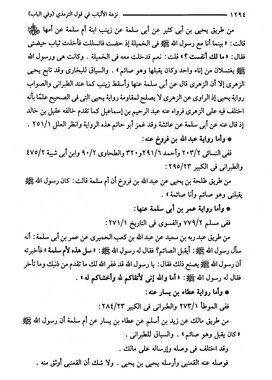 من طريق طلحة بن يحيى عن عبد الله بن فروخ أن أم سلمة قالت: كان رسول الله - صلى الله عليه وسلم - يقبلنى وهو صائم وأنا صائمة".