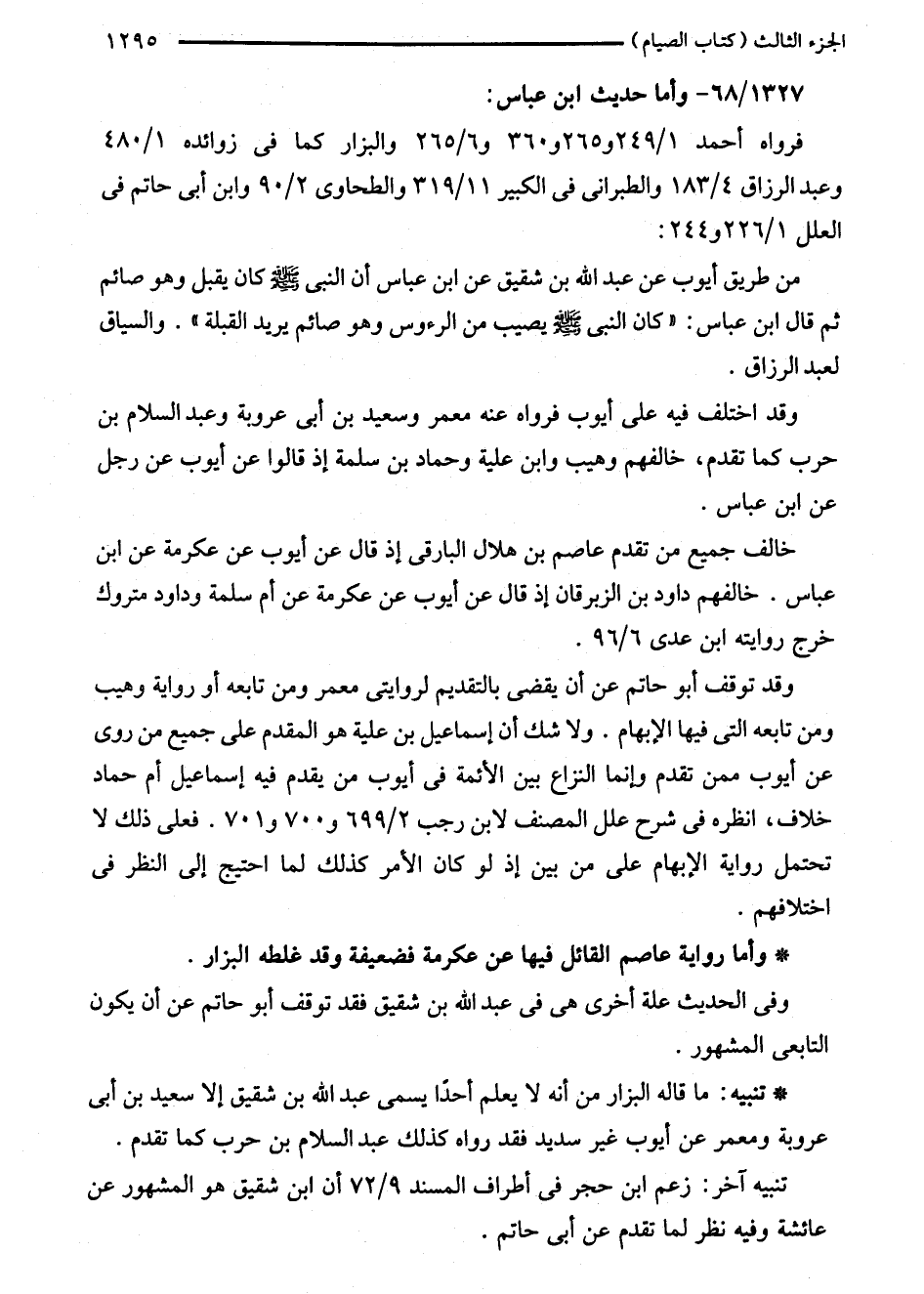 من طريق أيوب عن عبد الله بن شقيق عن ابن عباس أن النبي - صلى الله عليه وسلم - كان يقبل وهو صائم ثم قال ابن عباس: "كان النبي - صلى الله عليه وسلم - يصيب من الرءوس وهو صائم يريد القبلة". والسياق لعبد الرزاق.