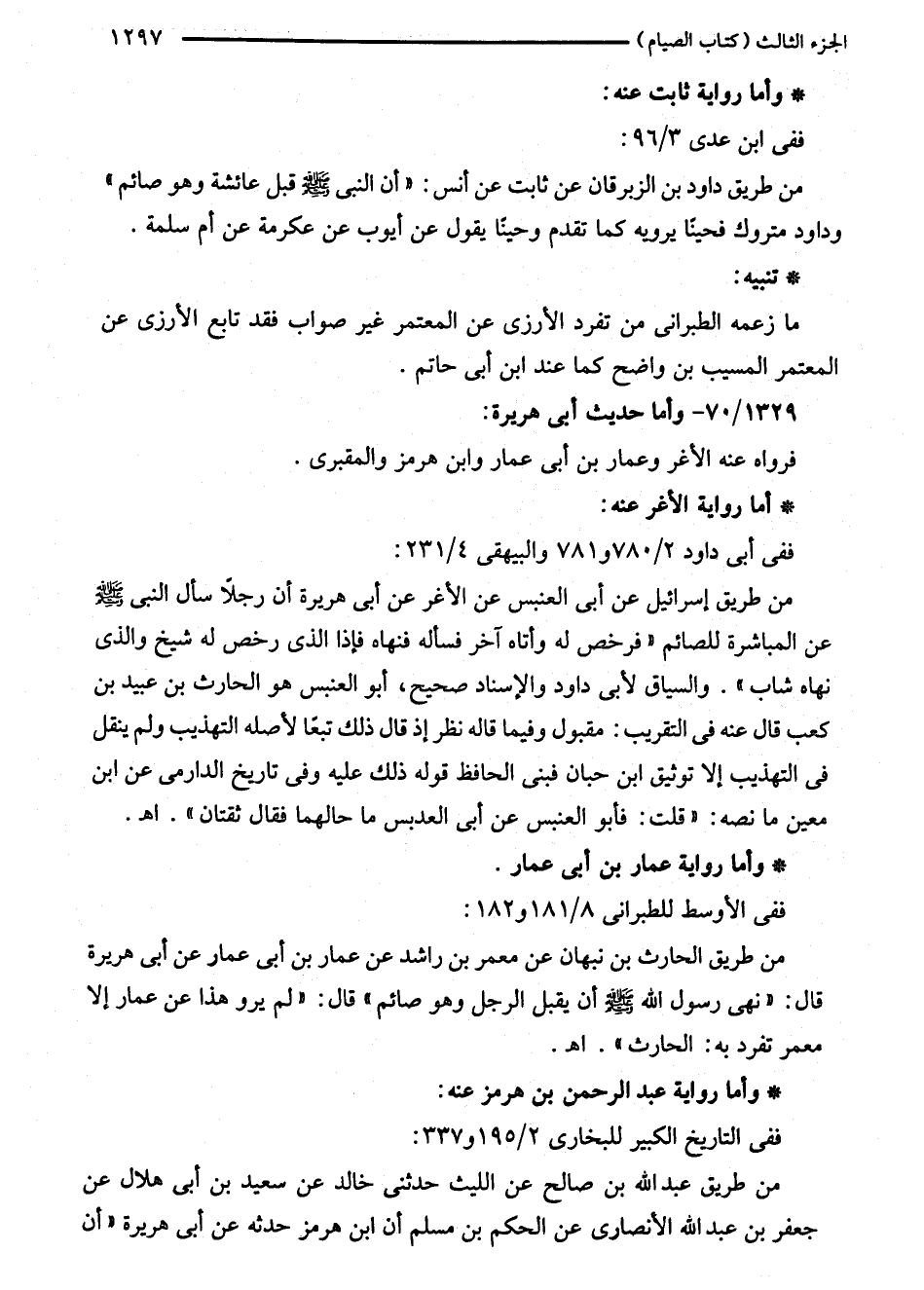 من طريق الحارث بن نبهان عن معمر بن راشد عن عمار بن أبى عمار عن أبى هريرة قال: "نهى رسول الله - صلى الله عليه وسلم - أن يقبل الرجل وهو صائم" قال: "لم يرو هذا عن عمار إلا معمر تفرد به: الحارث". اهـ.