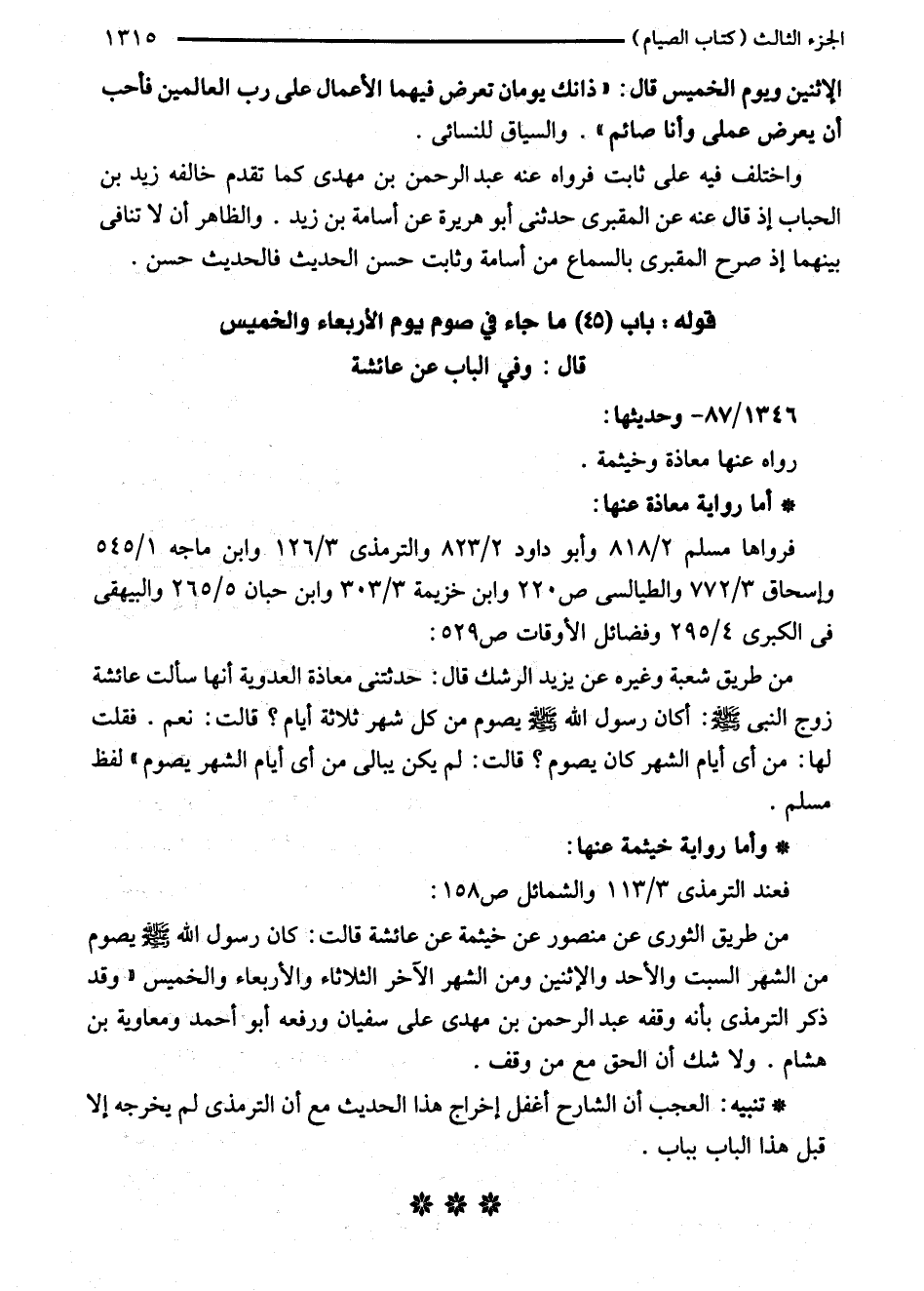 من طريق الثورى عن منصور عن خيثمة عن عائشة قالت: كان رسول الله - صلى الله عليه وسلم - يصوم من الشهر السبت والأحد والإثنين ومن الشهر الآخر الثلاثاء والأربعاء والخميس "وقد ذكر الترمذي بأنه وقفه عبد الرحمن بن مهدى على سفيان ورفعه أبو أحمد ومعاوية بن هشام. ولا شك أن الحق مع من وقف.