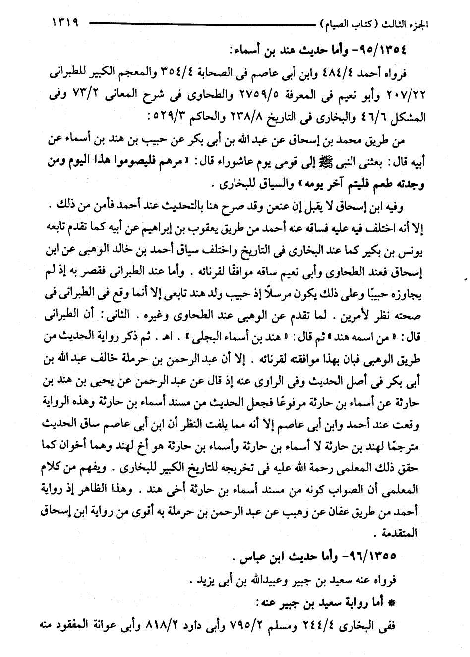 من طريق محمد بن إسحاق عن عبد الله بن أبى بكر عن حبيب بن هند بن أسماء عن أبيه قال: بعثنى النبي - صلى الله عليه وسلم - إلى قومى يوم عاشوراء قال: "مرهم فليصوموا هذا اليوم ومن وجدته طعم فليتم آخر يومه" والسياق للبخاري.