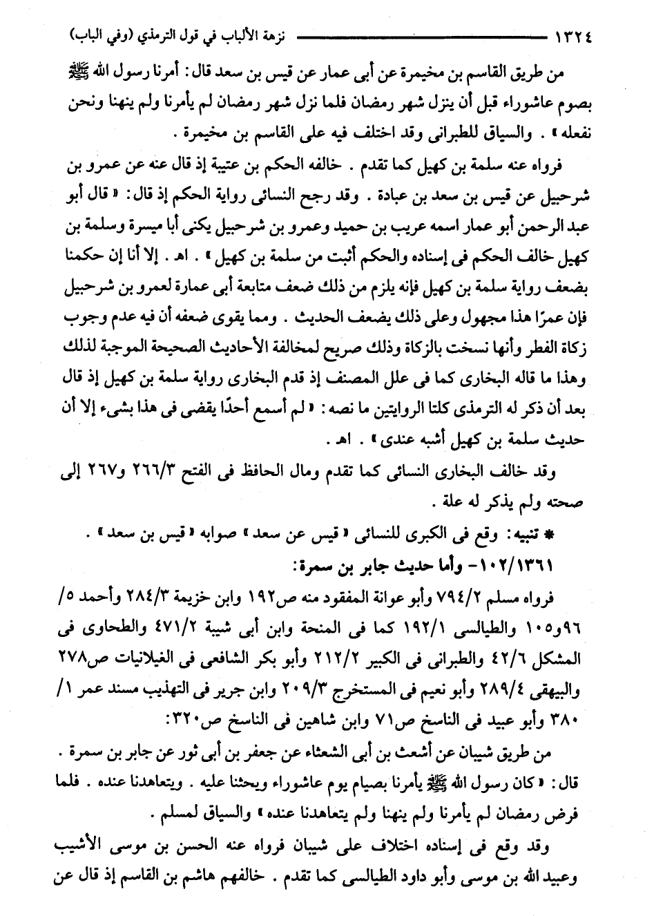 فرواه عنه سلمة بن كهيل كما تقدم. خالفه الحكم بن عتبة إذ قال عنه عن عمرو بن شرحبيل عن قيس بن سعد بن عبادة. وقد رجح النسائي رواية الحكم إذ قال: "قال أبو عبد الرحمن أبو عمار اسمه عريب بن حميد وعمرو بن شرحبيل يكنى أبا ميسرة وسلمة بن كهيل خالف الحكم في إسناده والحكم أثبت من سلمة بن كهيل". اهـ. إلا أنا إن حكمنا بضعف رواية سلمة بن كهيل فإنه يلزم من ذلك ضعف متابعة أبى عمارة لعمرو بن شرحبيل فإن عمرًا هذا مجهول وعلى ذلك يضعف الحديث. ومما يقوى ضعفه أن فيه عدم وجوب زكاة الفطر وأنها نسخت بالزكاة وذلك صريح لمخالفة الأحاديث الصحيحة الموجبة لذلك وهذا ما قاله البخاري كما في علل المصنف إذ قدم البخاري رواية سلمة بن كهيل إذ قال بعد أن ذكر له الترمذي كلتا الروايتين ما نصه: "لم أسمع أحدًا يقضى في هذا بشىء إلا أن حديث سلمة بن كهيل أشبه عندى". اهـ.
