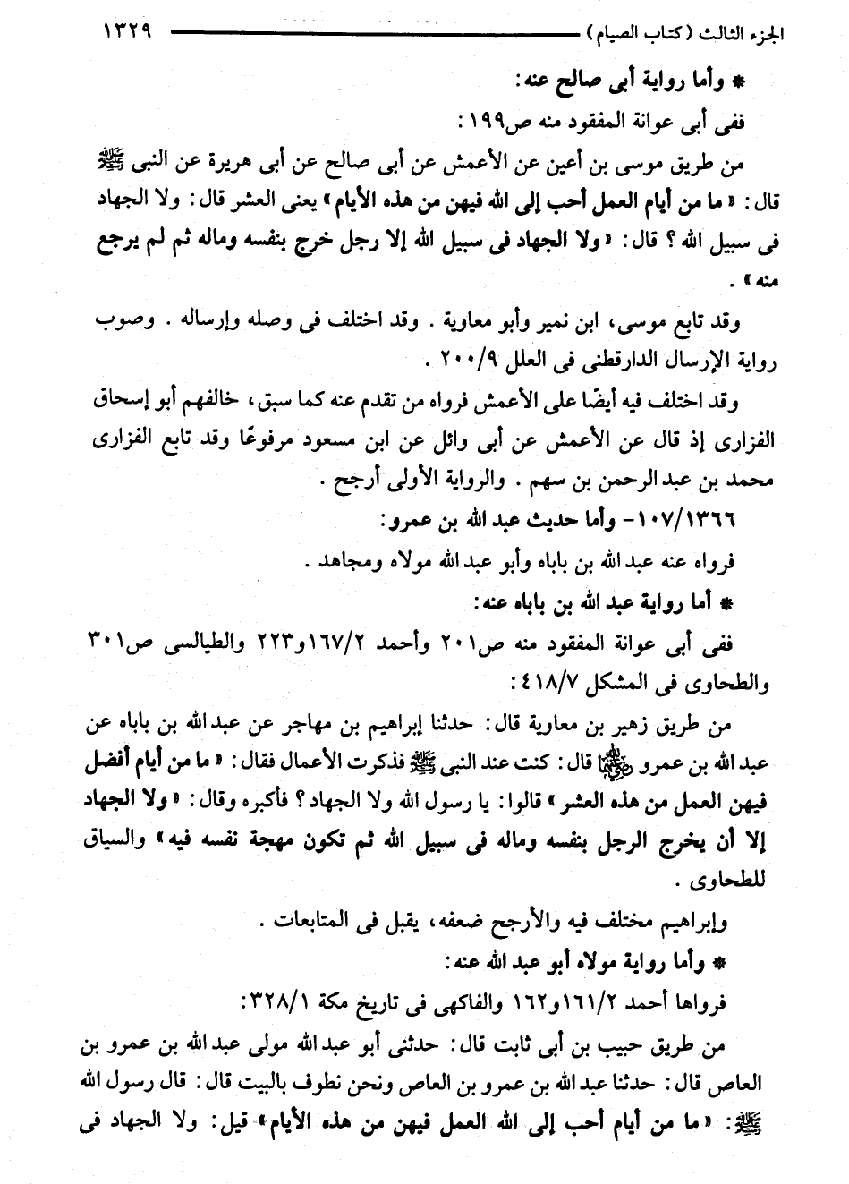 من طريق موسى بن أعين عن الأعمش عن أبى صالح عن أبى هريرة عن النبي - صلى الله عليه وسلم - قال: "ما من أيام العمل أحب إلى الله فيهن من هده الأيام" يعنى العشر قال: ولا الجهاد في سبيل الله؟ قال: "ولا الجهاد في سبيل الله إلا رجل خرج بنفسه وماله ثم لم يرجع منه".