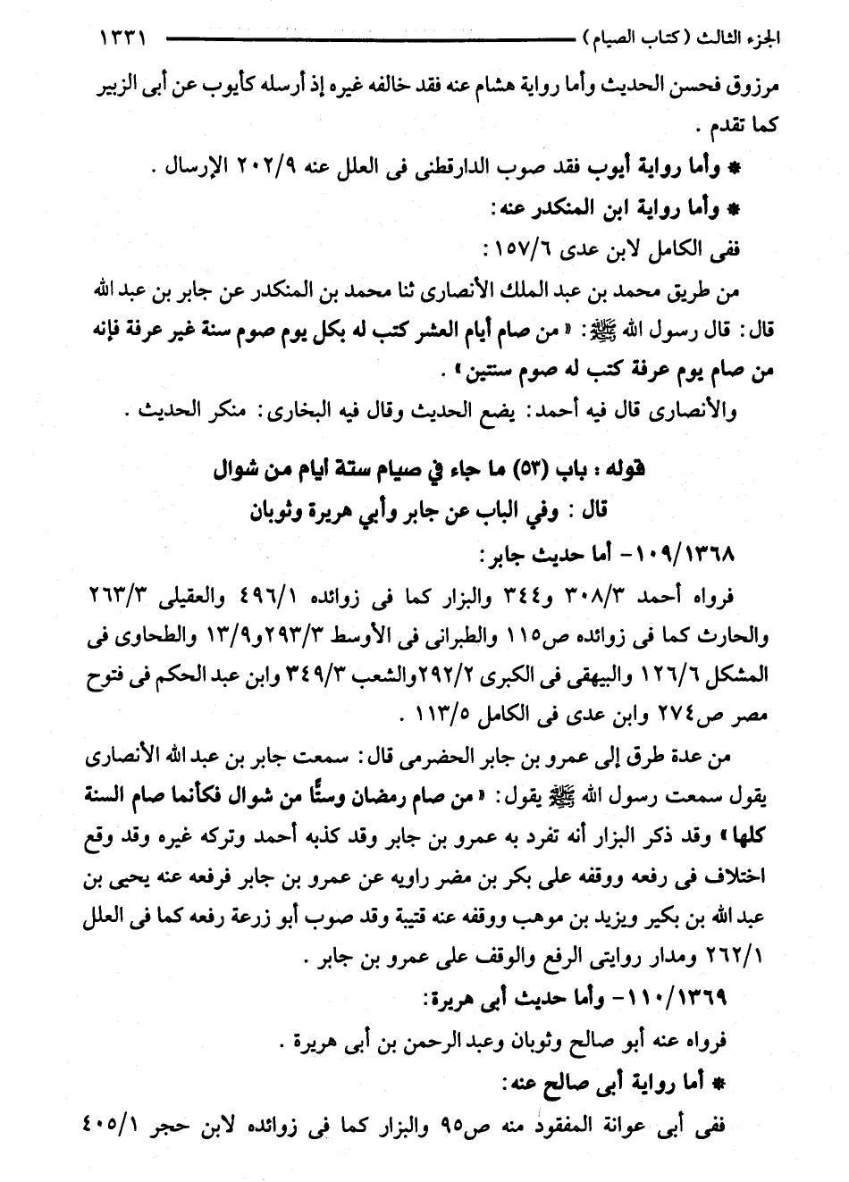 من عدة طرق إلى عمرو بن جابر الحضرمى قال: سمعت جابر بن عبد الله الأنصارى يقول سمعت رسول الله - صلى الله عليه وسلم - يقول: "من صام رمضان وستًّا من شوال فكأما صام السنة كلها" وقد ذكر البزار أنه تفرد به عمرو بن جابر وقد كذبه أحمد وتركه غيره وقد وقع اختلاف في رفعه ووقفه على بكر بن مضر راويه عن عمرو بن جابر فرفعه عنه يحيى بن عبد الله بن بكير ويزيد بن موهب ووقفه عنه قتيبة وقد صوب أبو زرعة رفعه كما في العلل 1/ 262 ومدار روايتى الرفع والوقف على عمرو بن جابر.