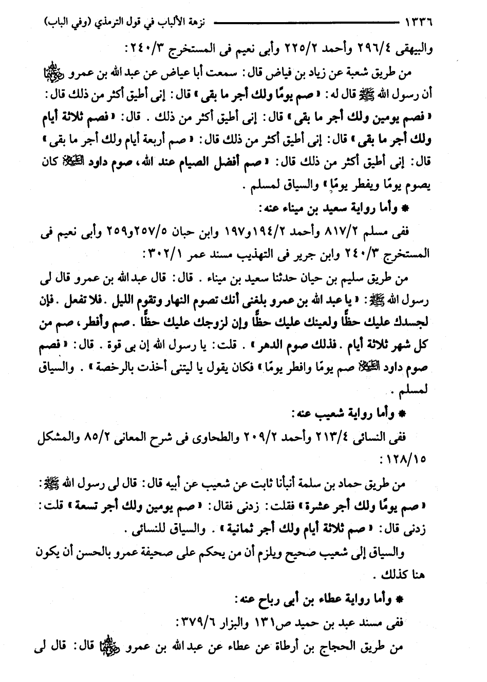 من طريق سليم بن حيان حدثنا سعيد بن ميناء. قال: قال عبد الله بن عمرو قال لى رسول الله - صلى الله عليه وسلم -: "يا عبد الله بن عمرو بلغنى أنك نصوم النهار وتقوم الليل. فلا تفعل. فإن لجسدك عليك حظًّا ولعينك عليك حظًّا وإن لزوجك عليك حظًّا. صم وأفطر، صم من كل شهر ثلاثة أيام. فذلك صوم الدهر". قلت: يا رسوال الله إن بى قوة. قال: "فصم صوم داود - عليه السلام - صم يومًا وافطر يومًا" فكان يقول يا ليتنى أخذت بالرخصة". والسياق لمسلم.