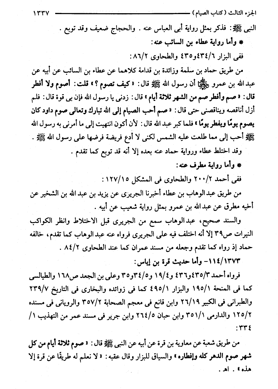 من طريق حماد بن سلمة وزائدة بن قدامة كلاهما عن عطاء بن السائب عن أبيه عن عبد الله بن عمرو - رضي الله عنهما - أن رسول الله - صلى الله عليه وسلم - قال: "كيف تصوم؟ " قلت: أصوم ولا أفطر قال: "صم وأفطر صم من الشهر ثلاثة أيام" قال: زدنى يا رسول الله فإن بى قوة قال: فلم أزل أناقصه ويناقصنى حتى قال: "صم أحب الصيام إلى الله تبارك وتعالى صوم داود كان يصوم يومًا ويفطر يومًا" فلما كبر عبد الله قال: لأن أكون انتهيت إلى ما أمرنى به رسول الله - صلى الله عليه وسلم - أحب إلى مما طلعت عليه الشمس لكنى لا أدع فريضة فرضها على رسول الله - صلى الله عليه وسلم -. وقد اختلط عطاء ورواية حماد عنه بعده إلا أنه قد توبع كما تقدم.