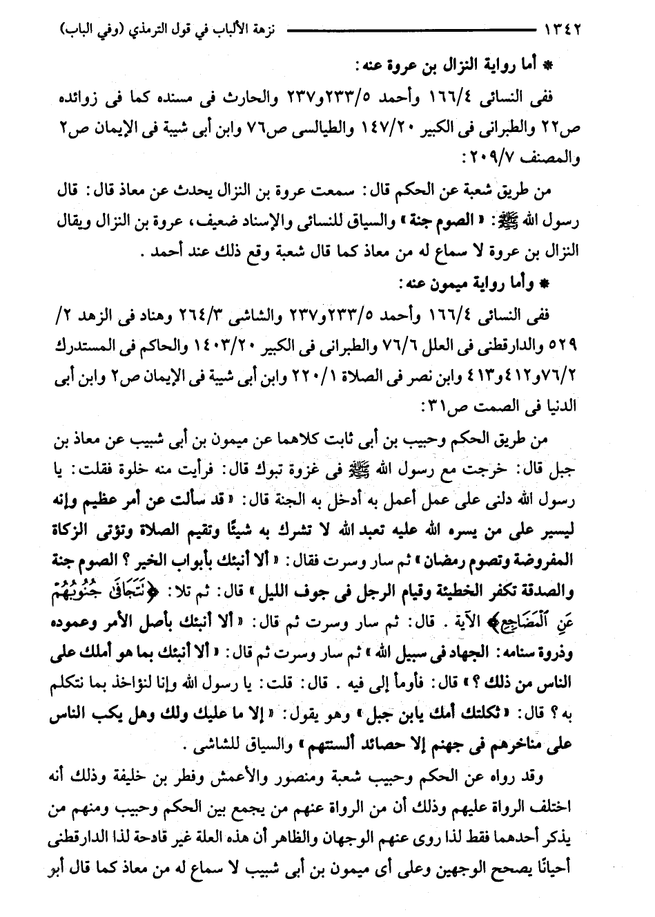 من طريق الحكم وحبيب بن أبى ثابت كلاهما عن ميمون بن أبى شبيب عن معاذ بن جبل قال: خرجت مع رسول الله - صلى الله عليه وسلم - في غزوة تبوك قال: فرأيت منه خلوة فقلت: يا رسول الله دلنى على عمل أعمل به أدخل به الجنة قال: "قد سألت عن أمر عظيم وإنه ليسير على من يسره الله عليه تعبد الله لا تشرك به شيئًا وتقيم الصلا وتؤتى الزكاة المفروضة وتصوم رمضان" ثم سار وسرت فقال: "ألا أنبئك بأبواب الخير؟ الصوم جنة والصدتة تكفر الخطيئة وقيام الرجل في جوف الليل" قال: ثم تلا: {تَتَجَافَى جُنُوبُهُمْ عَنِ الْمَضَاجِعِ} الآية. قال: ثم سار وسرت ثم. قال: "ألا أنبئك بأصل الأمر وعموده وذروة سنامه: الجهاد في سبيل الله" ثم سار وسرت ثم قال: "ألا أنبئك بما هو أملك على الناس من ذلك؟ " قال: فأومأ إلى فيه. قال: قلت: يا رسول الله وإنا لنؤاخذ بما نتكلم به؟ قال: "ثكلتك أمك يابن جبل" وهو يقول: "إلا ما عليك ولك وهل يكب الناس على مناخرهم في جهنم إلا حصائد ألسنتهم، والسياق للشاشى.