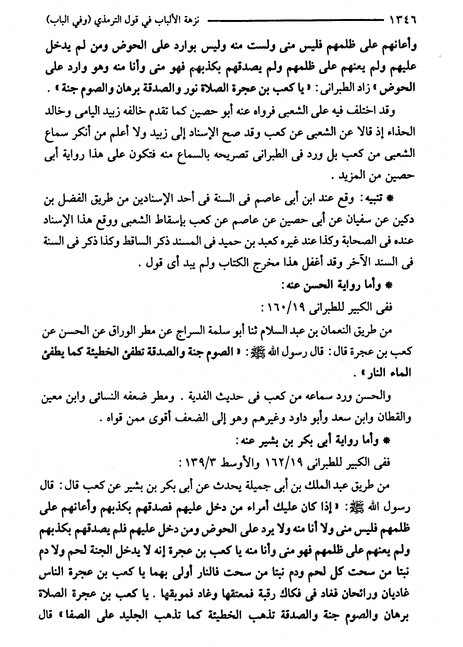 من طريق عبد الملك بن أبى جميلة يحدث عن أبى بكر بن بشير عن كعب قال: قال رسول الله - صلى الله عليه وسلم -: "إذا كان عليك أمراء من دخل عليهم فصدقهم بكذبهم وأعانهم على ظلمهم فليس منى ولا أنا منه ولا يرد على الحوض ومن دخل عليهم فلم يصدقهم بكذبهم ولم يعنهم على ظلمهم فهو منى وأنا منه يا كعب بن عجرة إنه لا يدخل الجنة لحم ولا دم نبتا من سحت كل لحم ودم نبتا من سحت فالنار أولى بهما يا كعب بن عجرة الناس غاديان ورائحان فغاد في فكاك رقبة فمعتقها وغاد فموبقها. يا كعب بن عجرة الصلاة برهان والصوم جنة والصدقة تذهب الخطيئة كما تذهب الجليد على الصفا" قال