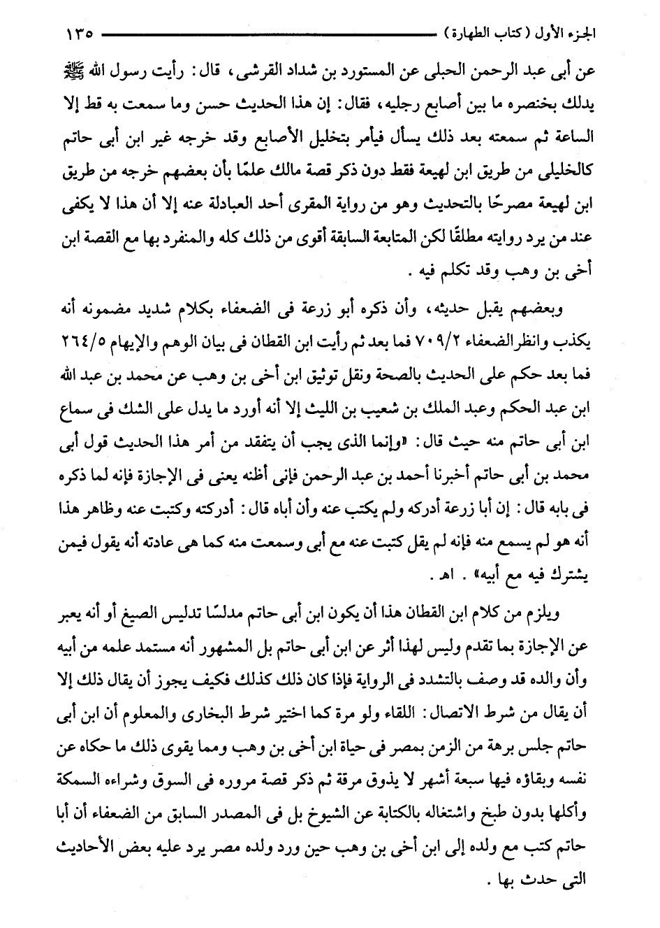 عن أبى عبد الرحمن الحبلى عن المستورد بن شداد القرشي، قال: رأيت رسول الله - صلى الله عليه وسلم - يدلك بخنصره ما بين أصابع رجليه، فقال: إن هذا الحديث حسن وما سمعت به قط إلا الساعة ثم سمعته بعد ذلك يسأل فيأمر بتخليل الأصابع وقد خرجه غير ابن أبى حاتم كالخليلى من طريق ابن لهيعة فقط دون ذكر قصة مالك علمًا بأن بعضهم خرجه من طريق ابن لهيعة مصرحًا بالتحديث وهو من رواية المقرى أحد العبادلة عنه إلا أن هذا لا يكفى عند من يرد روايته مطلقًا لكن المتابعة السابقة أقوى من ذلك كله والمنفرد بها مع القصة ابن أخى بن وهب وقد تكلم فيه.
