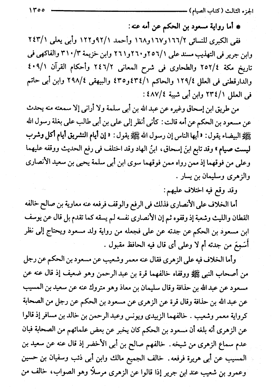 من طريق ابن إسحاق وغيره عن عبد الله بن أبى سلمة ولا أرانى إلا سمعته منه يحدث عن مسعود بن الحكم عن أمه قالت: كأنى أنظر إلى على بن أبى طالب على بغلة رسول الله - صلى الله عليه وسلم - البيضاء يقول: "أيها الناس إن رسول الله - صلى الله عليه وسلم - يقول: "إن أيام التشريق أيام أكل وشرب ليست صيام" وقد تابع ابنَ إسحاق، ابنُ الهاد وقد اختلف في رفع الحديث ووقفه عليهما وعلى من فوقهما إذ ممن رواه ممن فوقهما سوى ابن أبى سلمة يحيى بن سعيد الأنصارى والزهرى وسليمان بن يسار.