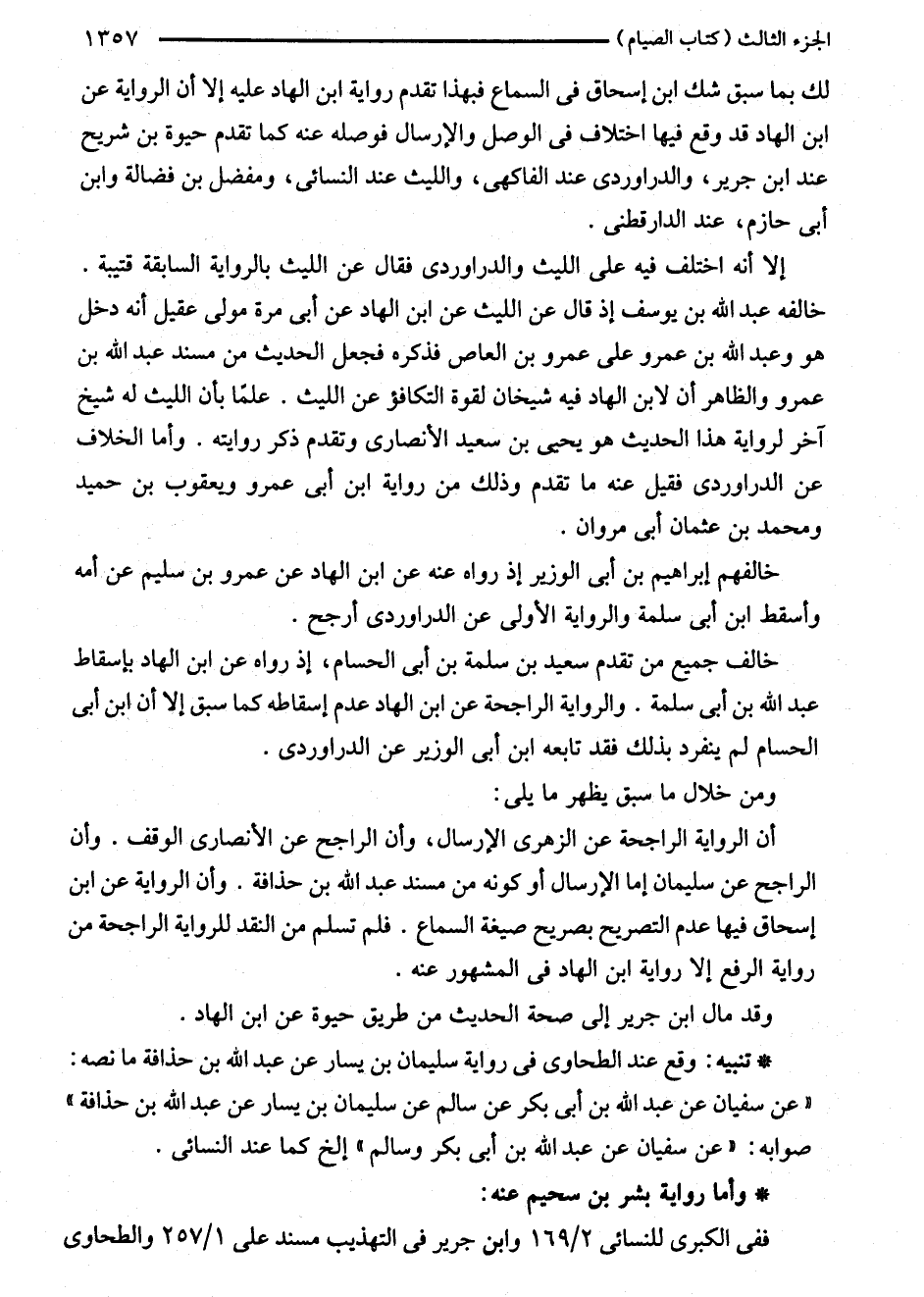 لك بما سبق شك ابن إسحاق في السماع فبهذا تقدم رواية ابن الهاد عليه إلا أن الرواية عن ابن الهاد قد وقع فيها اختلاف في الوصل والإرسال فوصله عنه كما تقدم حيوة بن شريح عند ابن جرير، والدراوردى عند الفاكهى، والليث عند النسائي، ومفضل بن فضالة وابن أبى حازم، عند الدارقطني.