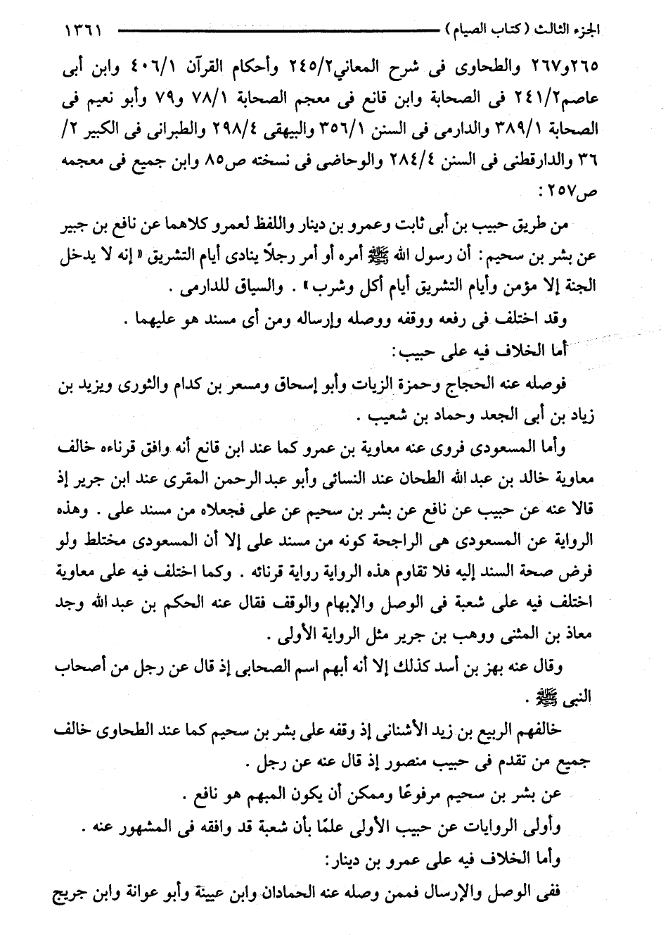 من طريق حبيب بن أبى ثابت وعمرو بن دينار واللفظ لعمرو كلاهما عن نافع بن جبير عن بشر بن سحيم: أن رسول الله - صلى الله عليه وسلم - أمره أو أمر رجلًا ينادى أيام التشريق "إنه لا يدخل الجنة إلا مؤمن وأيام التشريق أيام كل وشرب". والسياق للدارمى.