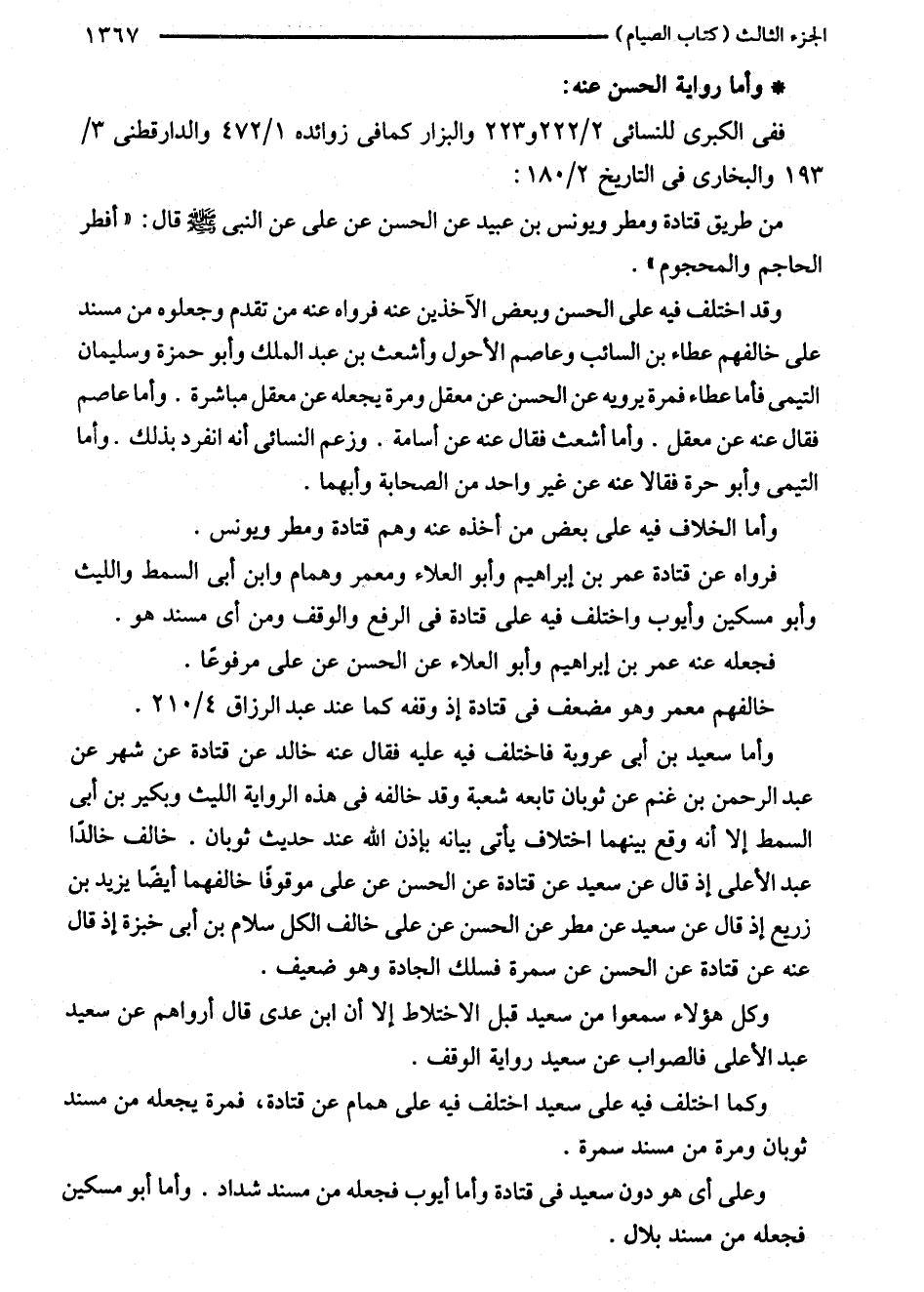 من طريق قتادة ومطر ويونس بن عبيد عن الحسن عن على عن النبي - صلى الله عليه وسلم -قال: "أفطر الحاجم والمحجوم".