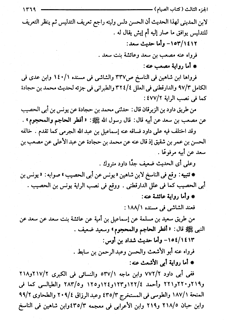 من طريق داود بن الزبرقان قال: حدثنى محمد بن حجادة عن يونس بن أبى الحصيب عن مصعب بن سعد عن أبيه قال: قال رسول الله - صلى الله عليه وسلم -: "أفطر الحاجم والمحجوم".