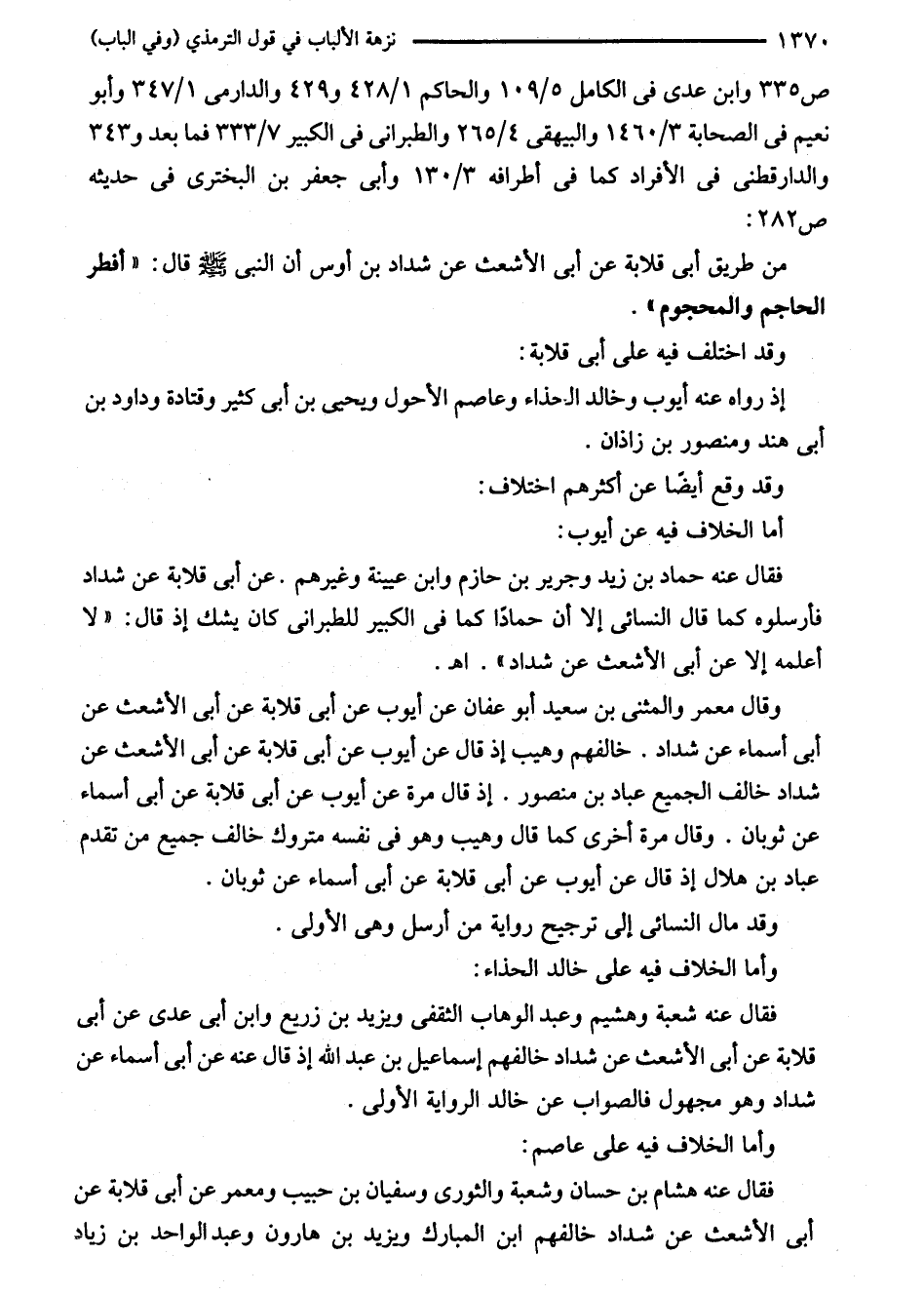 فقال عنه حماد بن زيد وجرير بن حازم وابن عيينة وغيرهم. عن أبى قلابة عن شداد فأرسلوه كما قال النسائي إلا أن حمادًا كما في الكبير للطبراني كان يشك إذ قال: "لا أعلمه إلا عن أبى الأشعث عن شداد". اهـ.
