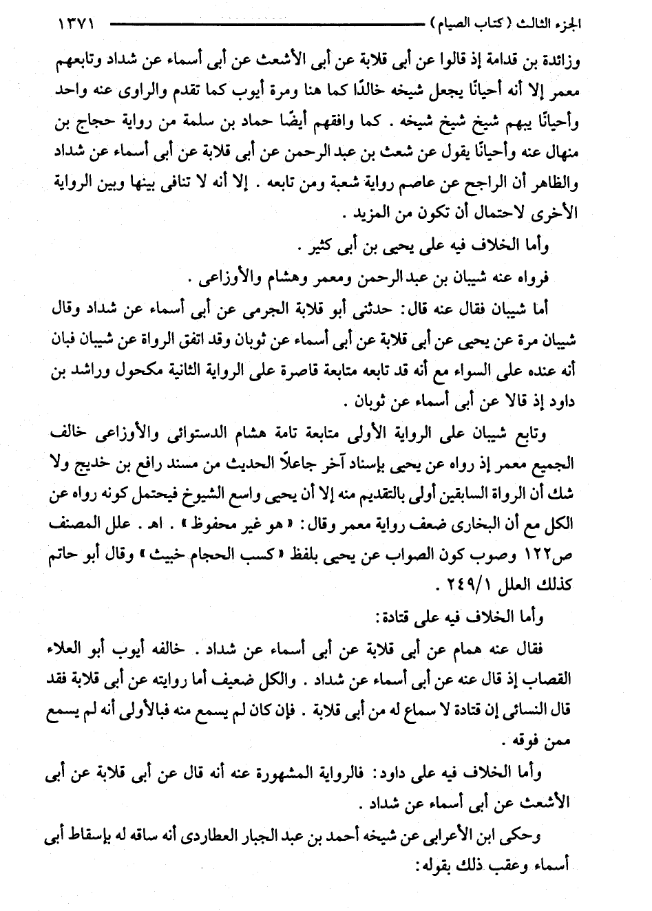 فقال عنه همام عن أبى قلابة عن أبى أسماء عن شداد. خالفه أيوب أبو العلاء القصاب إذ قال عنه عن أبى أسماء عن شداد. والكل ضعيف أما روايته عن أبى قلابة فقد قال النسائي إن قتادة لا سماع له من أبى قلابة. فإن كان لم يسمع منه فبالأولى أنه لم يسمع ممن فوقه.