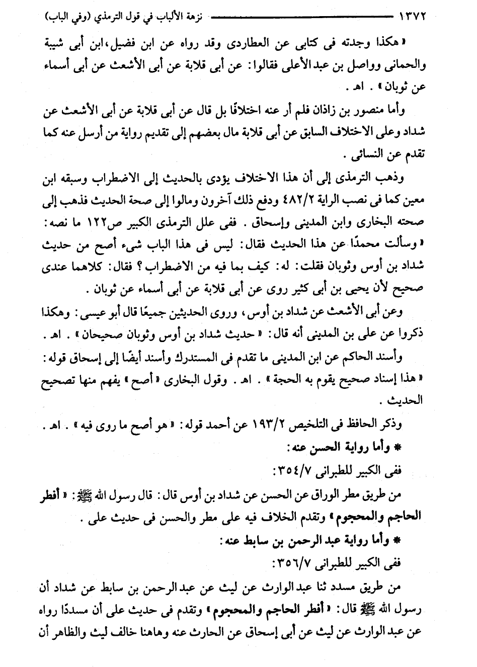 وذهب الترمذي إلى أن هذا الاختلاف يؤدى بالحديث إلى الاضطراب وسبقه ابن معين كما في نصب الراية 2/ 482 ودفع ذلك آخرون ومالوا إلى صحة الحديث فذهب إلى صحته البخاري وابن المدينى وإسحاق. ففي علل الترمذي الكبير ص 122 ما نصه: "وسألت محمدًا عن هذا الحديث فقال: ليس في هذا الباب شىء أصح من حديث شداد بن أوس وثوبان فقلت: له: كيف بما فيه من الاضطراب؟ فقال: كلاهما عندى صحيح لأن يحيى بن أبى كثير روى عن أبى قلابة عن أبى أسماء عن ثوبان.