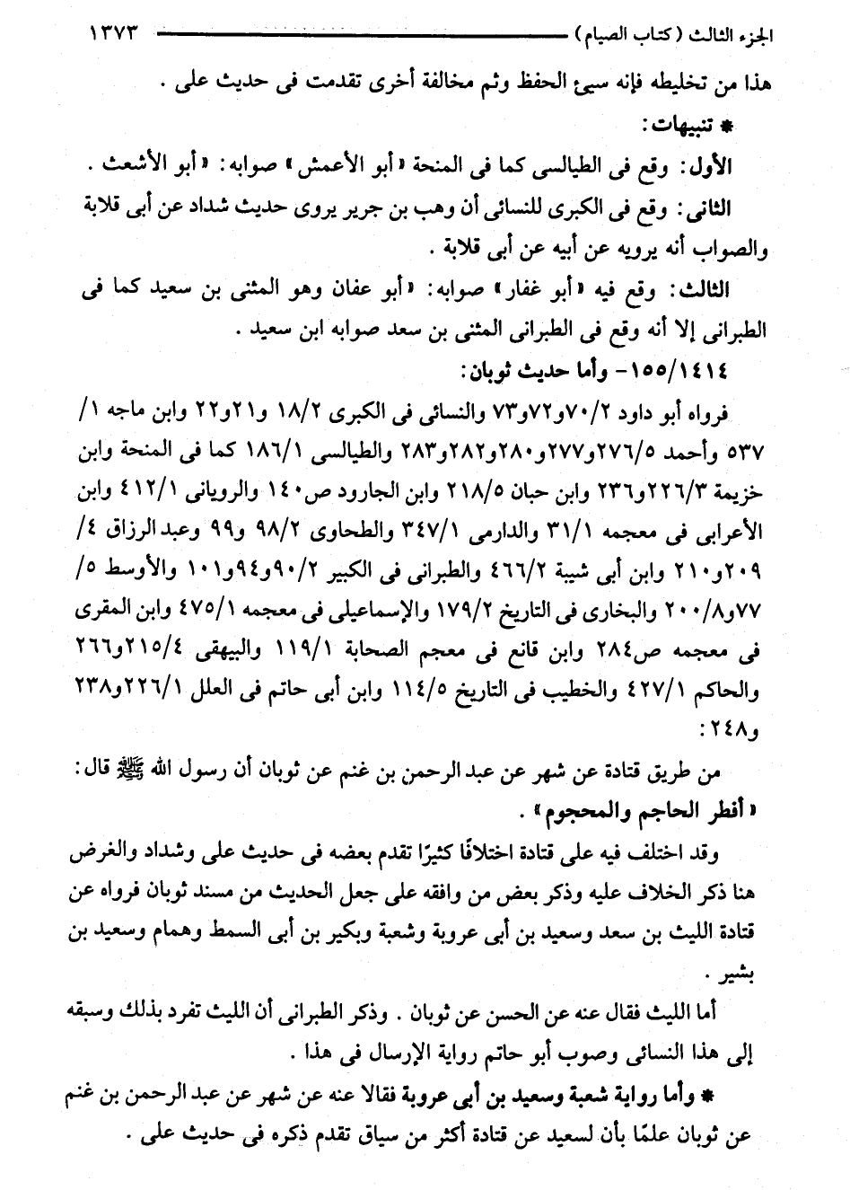 * وأما رواية شعبة وسعيد بن أبى عروبة فقالا عنه عن شهر عن عبد الرحمن بن غنم عن ثوبان علمًا بأن لسعيد عن قتادة أكثر من سياق تقدم ذكره في حديث على.