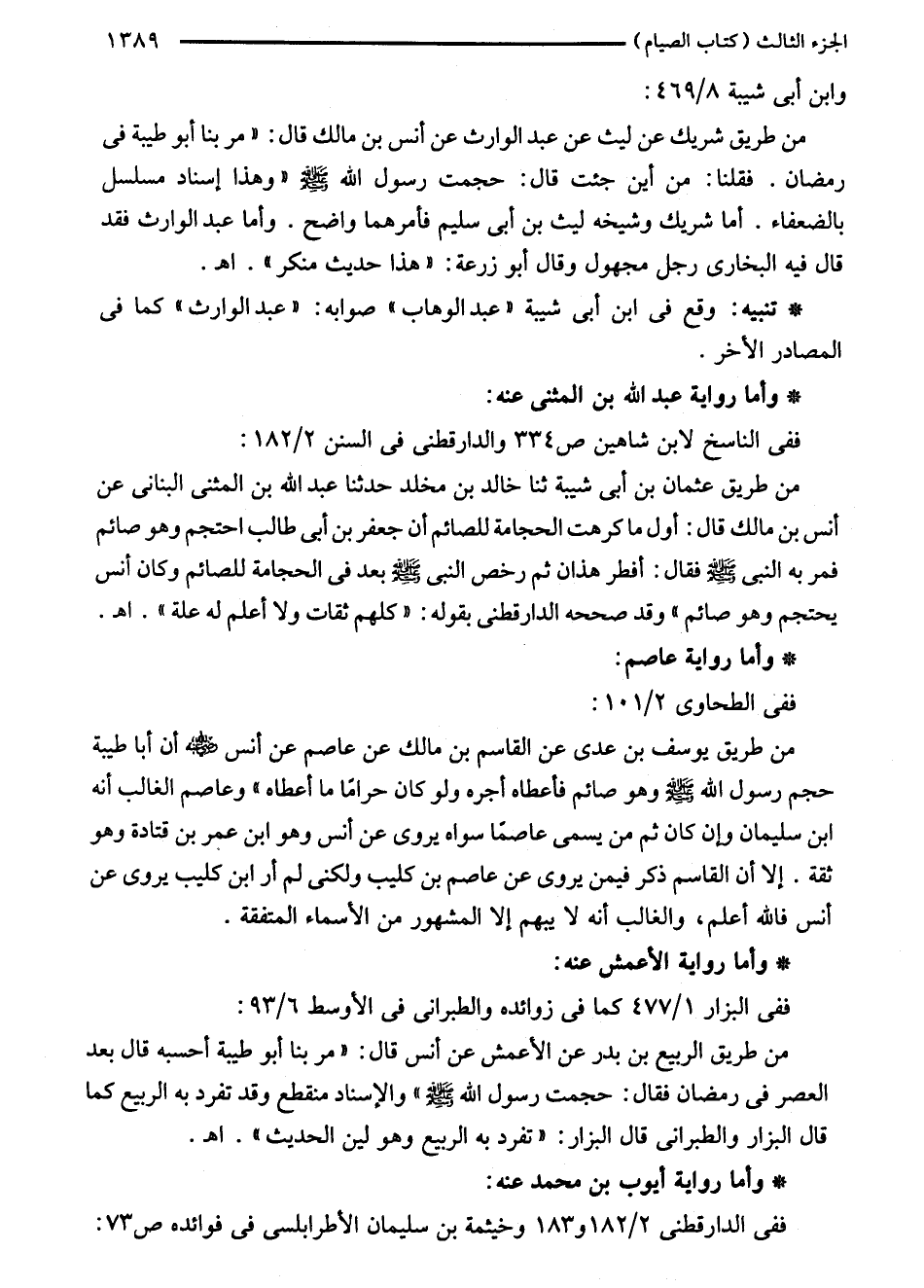 من طريق شريك عن ليث عن عبد الوارث عن أنس بن مالك قال: "مر بنا أبو طيبة في رمضان. فقلنا: من أين جئت قال: حجمت رسول الله - صلى الله عليه وسلم - "وهذا إسناد مسلسل بالضعفاء. أما شريك وشيخه ليث بن أبى سليم فأمرهما واضح. وأما عبد الوارث فقد قال فيه البخاري رجل مجهول وقال أبو زرعة: "هذا حديث منكر". اهـ.