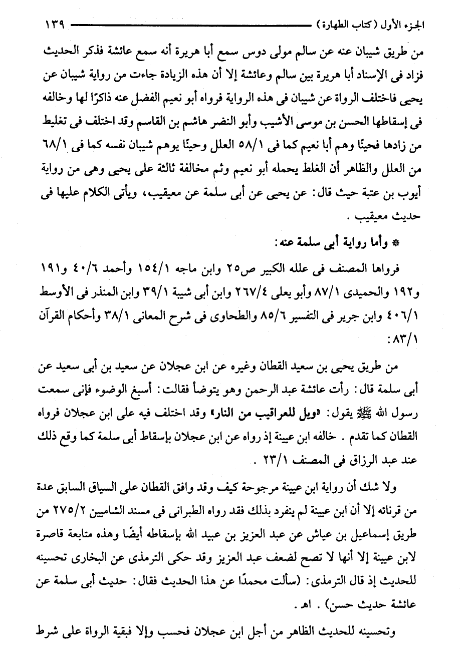 من طريق يحيى بن سعيد القطان وغيره عن ابن عجلان عن سعيد بن أبى سعيد عن أبى سلمة قال: رأت عائشة عبد الرحمن وهو يتوضأ فقالت: أسبغ الوضوء فإنى سمعت رسول الله - صلى الله عليه وسلم - يقول: "ويل للعراقيب من النار" وقد اختلف فيه على ابن عجلان فرواه القطان كما تقدم. خالفه ابن عيينة إذ رواه عن ابن عجلان بإسقاط أبى سلمة كما وقع ذلك عند عبد الرزاق في المصنف 1/ 23.