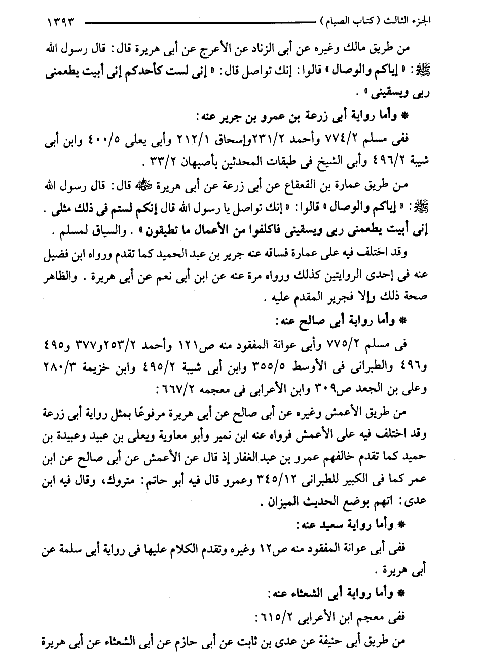 من طريق عمارة بن القعقاع عن أبى زرعة عن أبى هريرة - رضي الله عنه - قال: قال رسول الله - صلى الله عليه وسلم -: "إياكم والوصال" قالوا: "إنك تواصل يا رسول الله قال إنكم لستم في ذلك مثلى. إنى أبيت يطعمنى ربى ويسقينى فاكلفوا من الأعمال ما تطيقون". والسياق لمسلم.