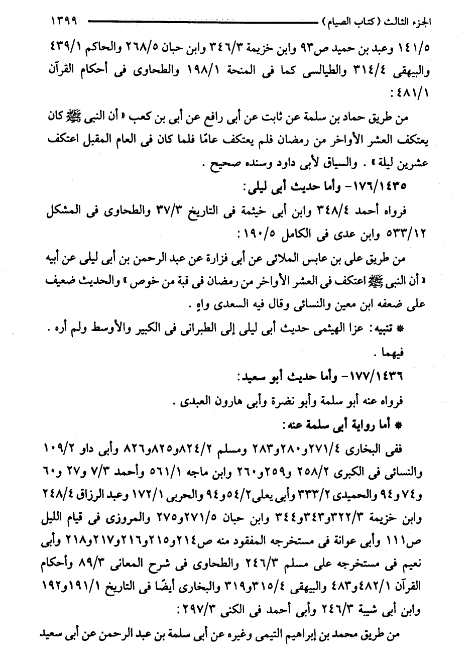 من طريق حماد بن سلمة عن ثابت عن أبى رافع عن أبى بن كعب "أن النبي - صلى الله عليه وسلم - كان يعتكف العشر الأواخر من رمضان فلم يعتكف عامًا فلما كان في العام المقبل اعتكف عشرين ليلة". والسياق لأبى داود وسنده صحيح.
