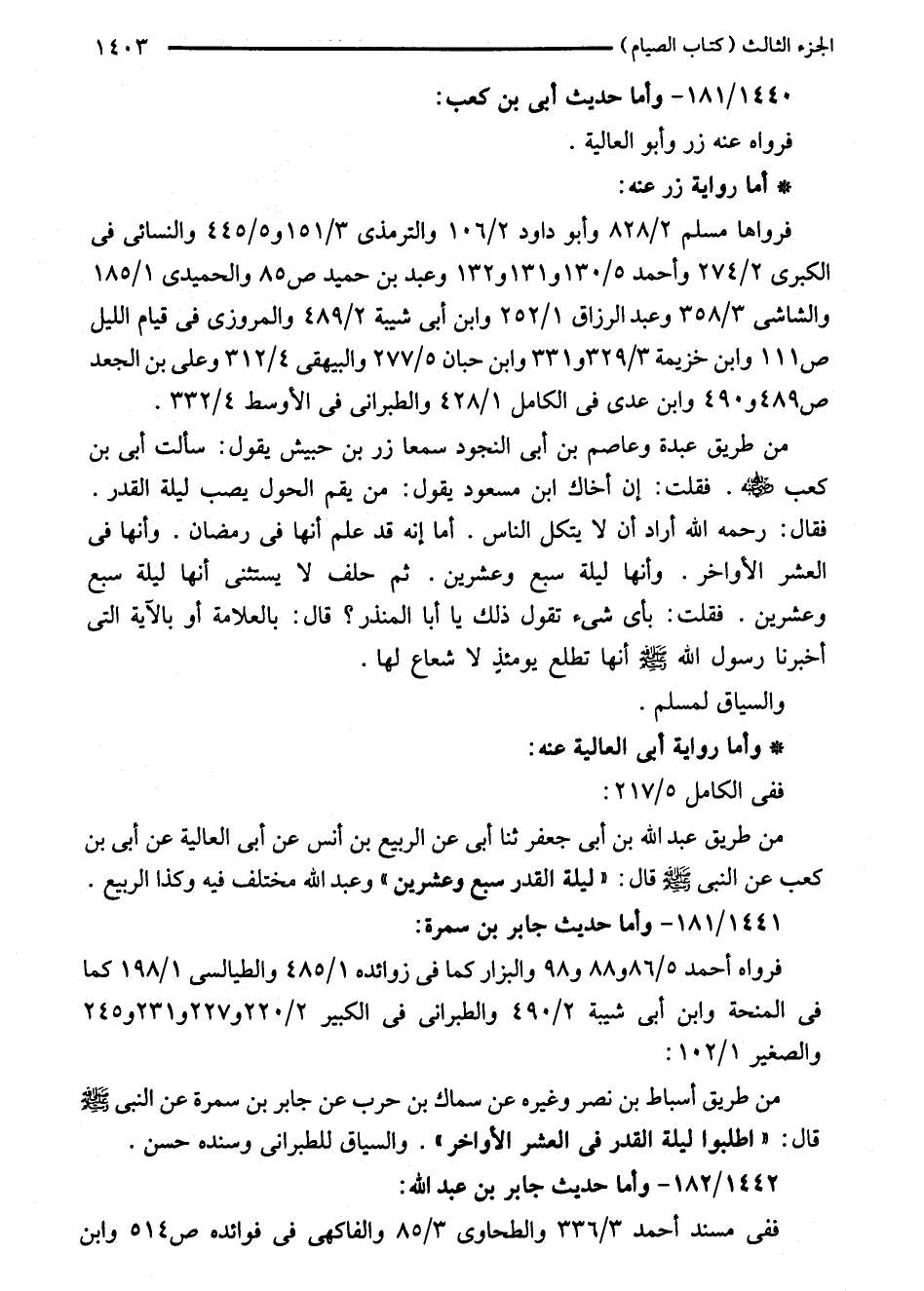من طريق عبد الله بن أبى جعفر ثنا أبى عن الربيع بن أنس عن أبى العالية عن أبى بن كعب عن النبي - صلى الله عليه وسلم - قال: "ليلة القدر سبع وعشرين" وعبد الله مختلف فيه وكذا الربيع. 1441/ 181 - وأما حديث جابر بن سمرة: