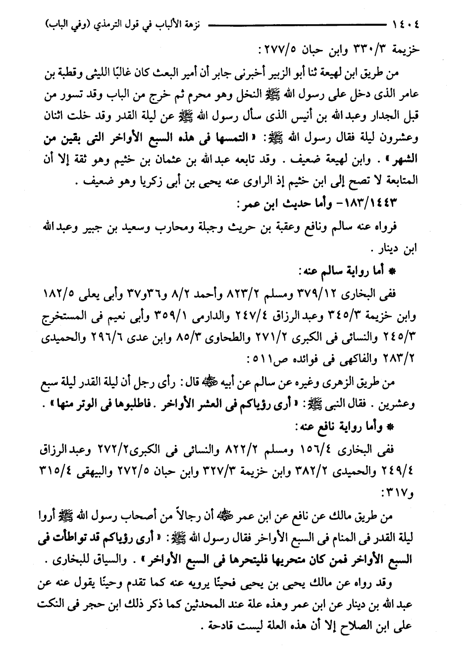 من طريق الزهرى وغيره عن سالم عن أبيه - رضي الله عنه - قال: رأى رجل أن ليلة القدر ليلة سبع وعشرين. فقال النبي - صلى الله عليه وسلم -: "أرى رؤياكم في العشر الأواخر. فاطلبوها في الوتر منها".
