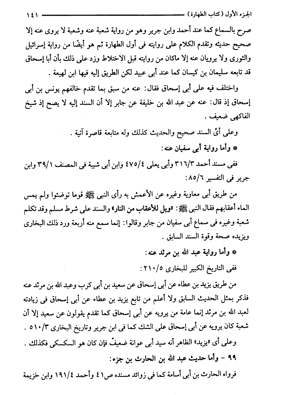 من طريق أبى معاوية وغيره عن الأعمش به رأى النبي - صلى الله عليه وسلم - قوما توضئوا ولم يمس الماء أعقابهم فقال النبي - صلى الله عليه وسلم -: "ويل للأعقاب من النار" والسند على شرط مسلم وقد تكلم شعبة وغيره في سماع أبى سفيان من جابر وقالوا: إنما سمع منه أربعة ورد ذلك البخاري ويزيده صحة وقوة السند السابق.