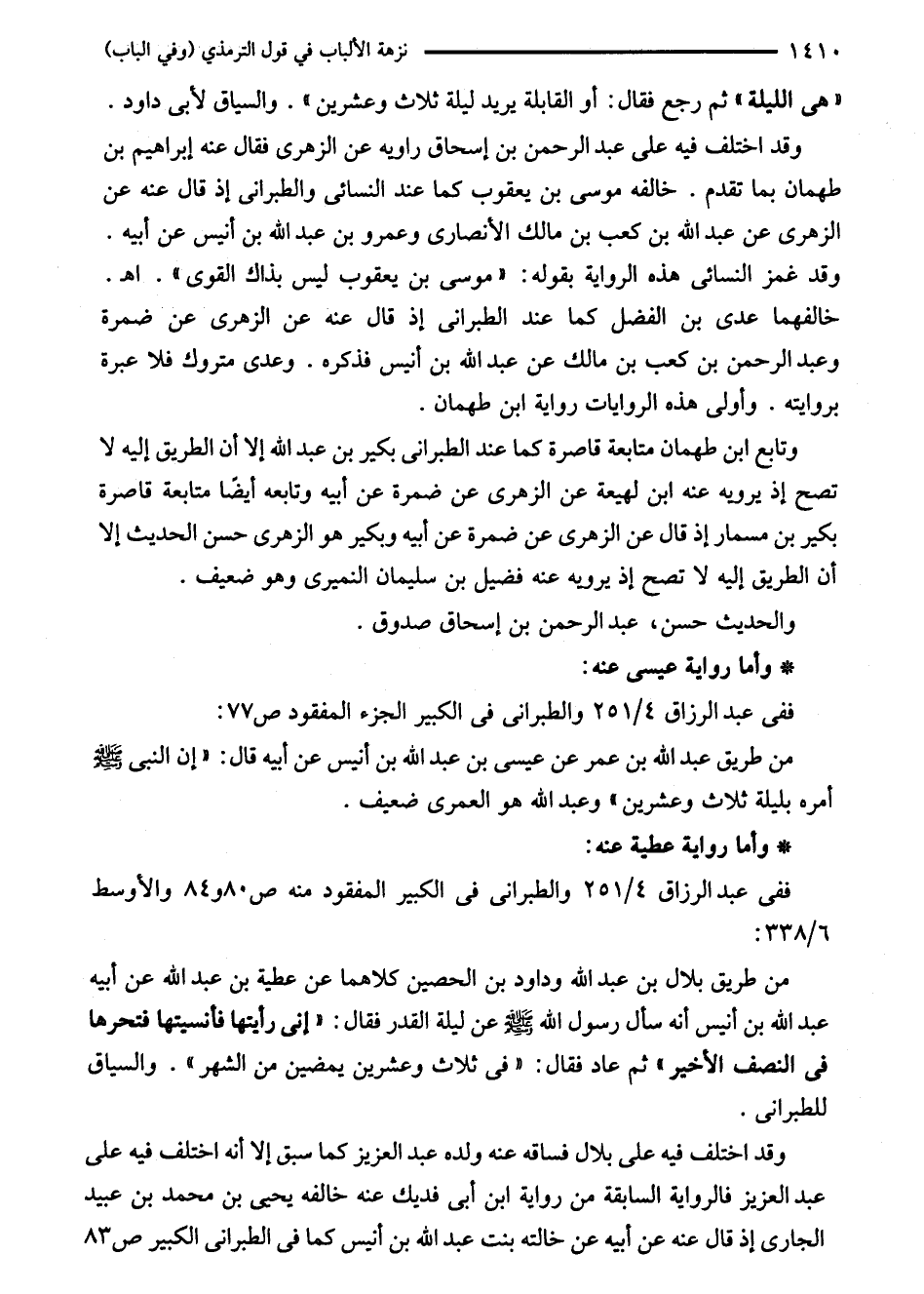 من طريق بلال بن عبد الله وداود بن الحصين كلاهما عن عطية بن عبد الله عن أبيه عبد الله بن أنيس أنه سأل رسول الله - صلى الله عليه وسلم - عن ليلة القدر فقال: "إنى رأيتها فأنسيتها فتحرها في النصف الأخير" ثم عاد فقال: "في ثلاث وعشرين يمضين من الشهر". والسياق للطبراني.