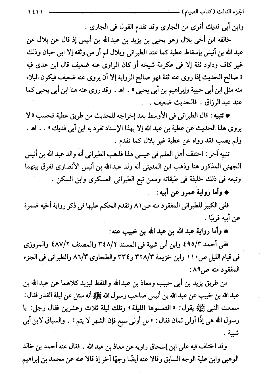 خالفه ابن أخى بلال وهو يحيى بن يزيد بن عبد الله بن أنيس إذ قال عن بلال عن عبد الله بن أنيس بإسقاط عطية كما عند الطبراني وبلال لم أر من وثقه إلا ابن حبان وذلك غير كاف وداود ثقة إلا في عكرمة شيخه أو كان الراوى عنه ضعيف قال ابن عدى فيه "صالح الحديث إذا روى عنه ثقة فهو صالح الرواية إلا أن يروى عنه ضعيف فيكون البلاء منه مثل ابن أبى حبيبة وإبراهيم بن أبى يحيى". اهـ. وقد روى عنه هنا ابن أبى يحيى كما عند عبد الرزاق. فالحديث ضعيف.