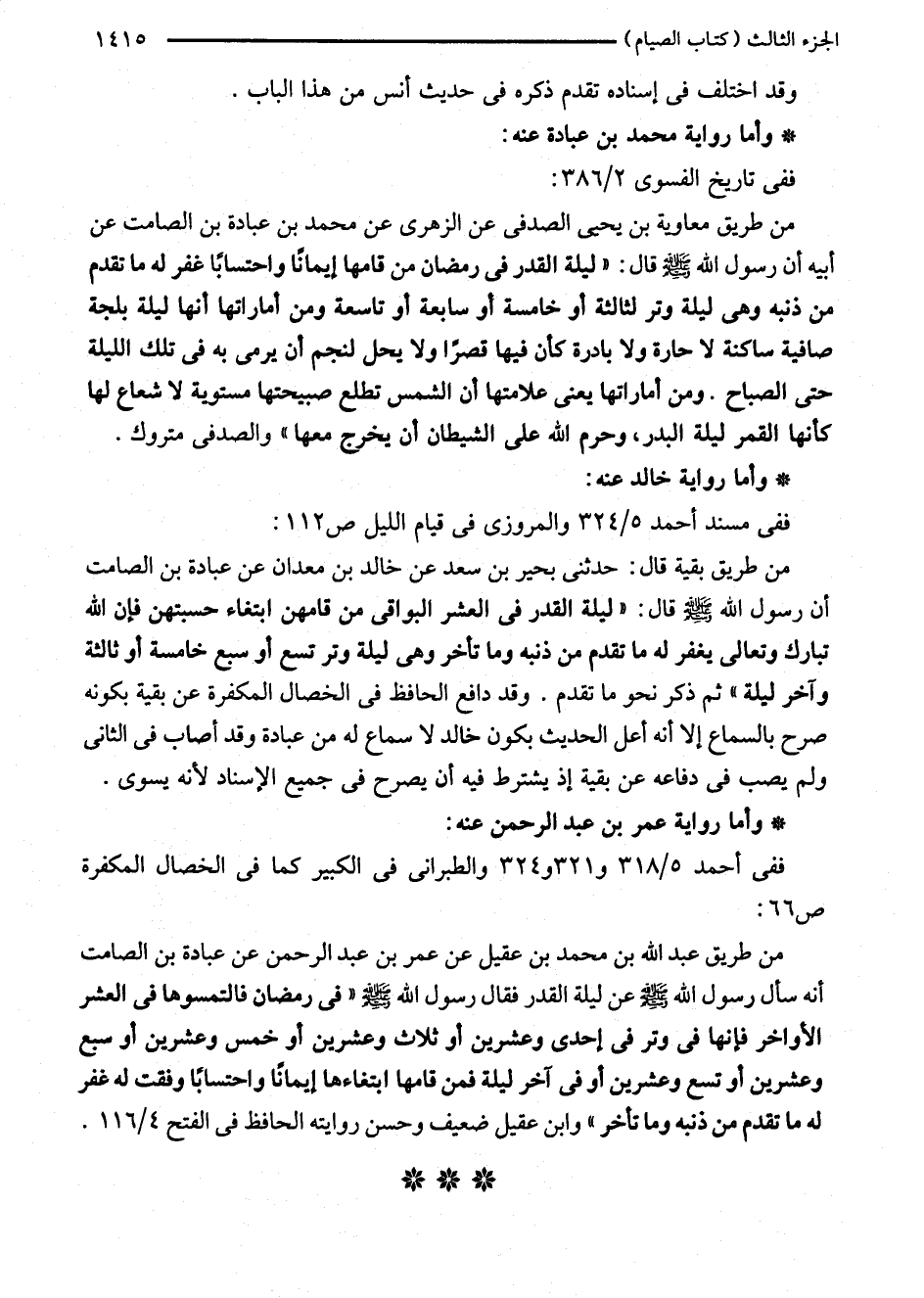 من طريق بقية قال: حدثنى بحير بن سعد عن خالد بن معدان عن عبادة بن الصامت أن رسول الله - صلى الله عليه وسلم - قال: "ليلة القدر في العشر البواقى من قامهن ابتغاء حسبتهن فإن الله تبارك وتعالى يغفر له ما تقدم من ذنبه وما تأخر وهى ليلة وتر تسع أو سبع خامسة أو ثالثة وآخر ليلة" ثم ذكر نحو ما تقدم. وقد دافع الحافظ في الخصال المكفرة عن بقية بكونه صرح بالسماع إلا أنه أعل الحديث بكون خالد لا سماع له من عبادة وقد أصاب في الثانى ولم يصب في دفاعه عن بقية إذ يشترط فيه أن يصرح في جميع الإسناد لأنه يسوى.