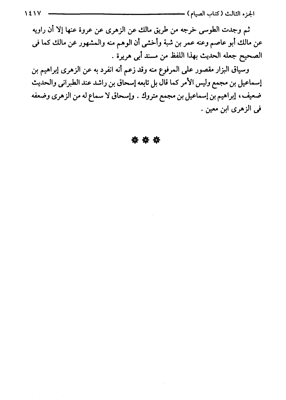وسياق البزار مقصور على المرفوع منه وقد زعم أنه انفرد به عن الزهرى إبراهيم بن إسماعيل بن مجمع وليس الأمر كما قال بل تابعه إسحاق بن راشد عند الطبراني والحديث ضعيف، إبراهيم بن إسماعيل بن مجمع متروك. وإسحاق لا سماع له من الزهرى وضعفه في الزهرى ابن معين.
