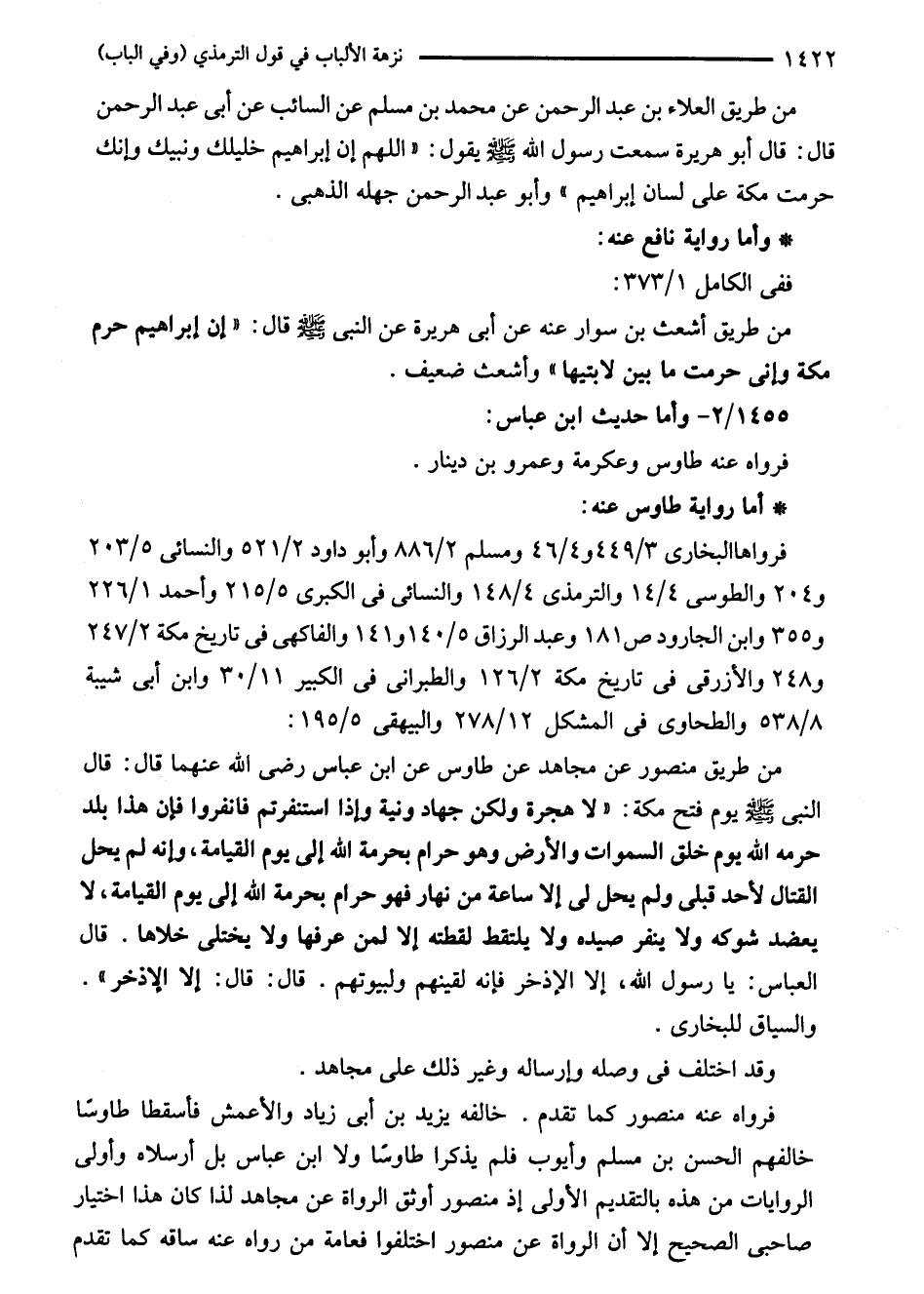 من طريق العلاء بن عبد الرحمن عن محمد بن مسلم عن السائب عن أبى عبد الرحمن قال: قال أبو هريرة سمعت رسول الله - صلى الله عليه وسلم - يقول: "اللهم إن إبراهيم خليلك ونبيك وإنك حرمت مكة على لسان إبراهيم" وأبو عبد الرحمن جهله الذهبى.