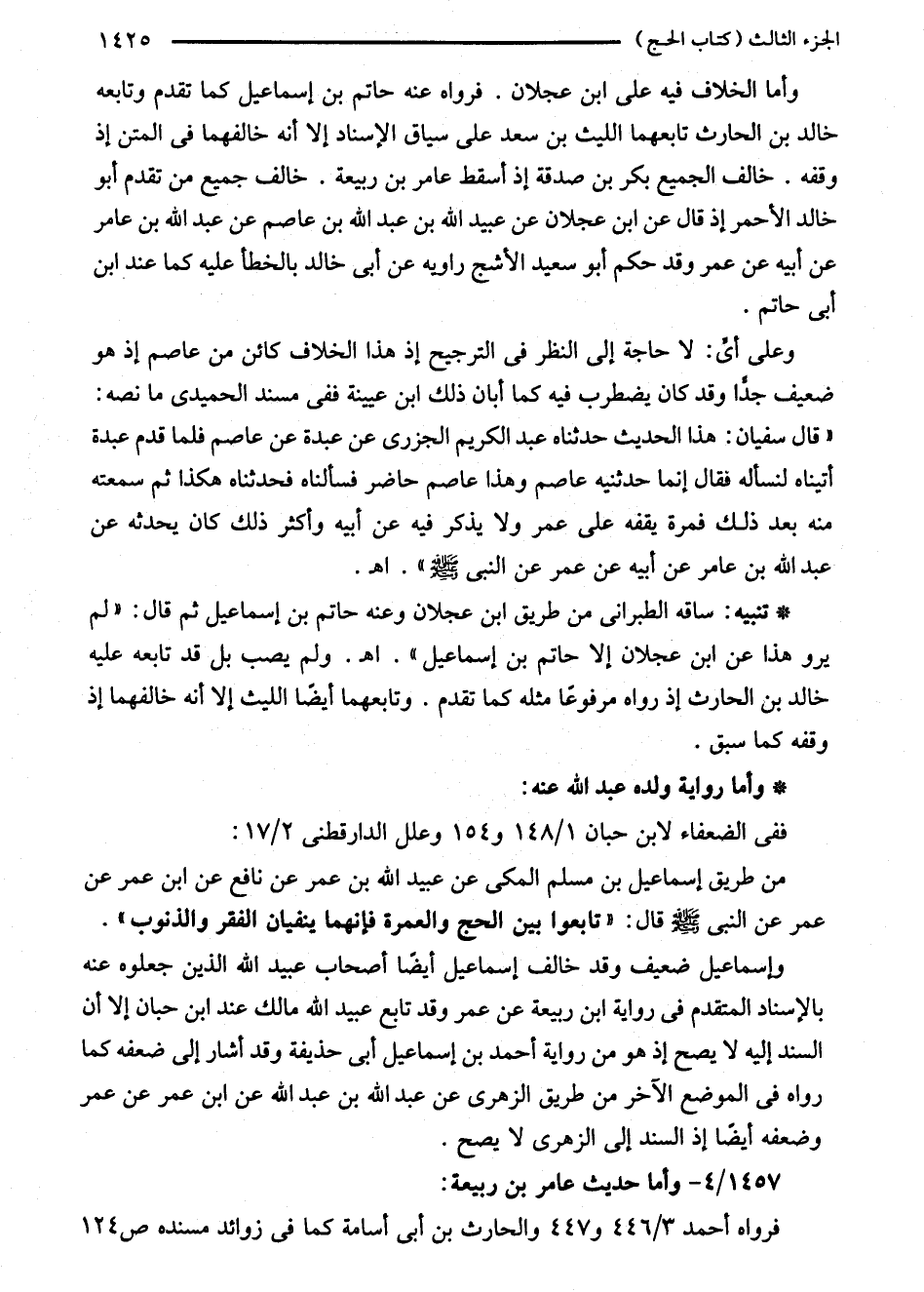وعلى أىِّ: لا حاجة إلى النظر في الترجيح إذ هذا الخلاف كائن من عاصم إذ هو ضعيف جدًّا وقد كان يضطرب فيه كما أبان ذلك ابن عيينة ففي مسند الحميدي ما نصه: "قال سفيان: هذا الحديث حدثناه عبد الكريم الجزرى عن عبدة عن عاصم فلما قدم عبدة أتياه لنسأله فقال إنما حدثنيه عاصم وهذا عاصم حاضر فسألناه فحدثناه هكذا ثم سمعته منه بعد ذلك فمرة يقفه على عمر ولا يذكر فيه عن أبيه وأكثر ذلك كان يحدثه عن عبد الله بن عامر عن أبيه عن عمر عن النبي - صلى الله عليه وسلم -". اهـ.