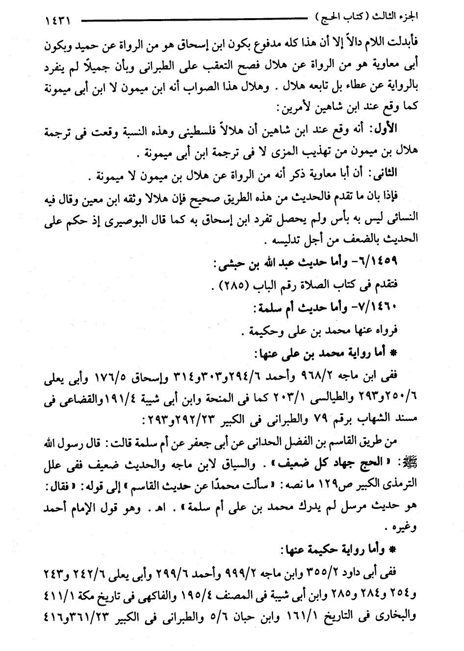 من طريق القاسم بن الفضل الحدانى عن أبى جعفر عن أم سلمة قالت: قال رسول الله - صلى الله عليه وسلم -: "الحج جهاد كل ضعيف". والسياق لابن ماجه والحديث ضعيف ففي علل الترمذي الكبير ص 129 ما نصه: "سألت محمدًا عن حديث القاسم" إلى قوله: "فقال: هو حديث مرسل لم يدرك محمد بن على أم سلمة". اهـ. وهو قول الإمام أحمد وغيره.