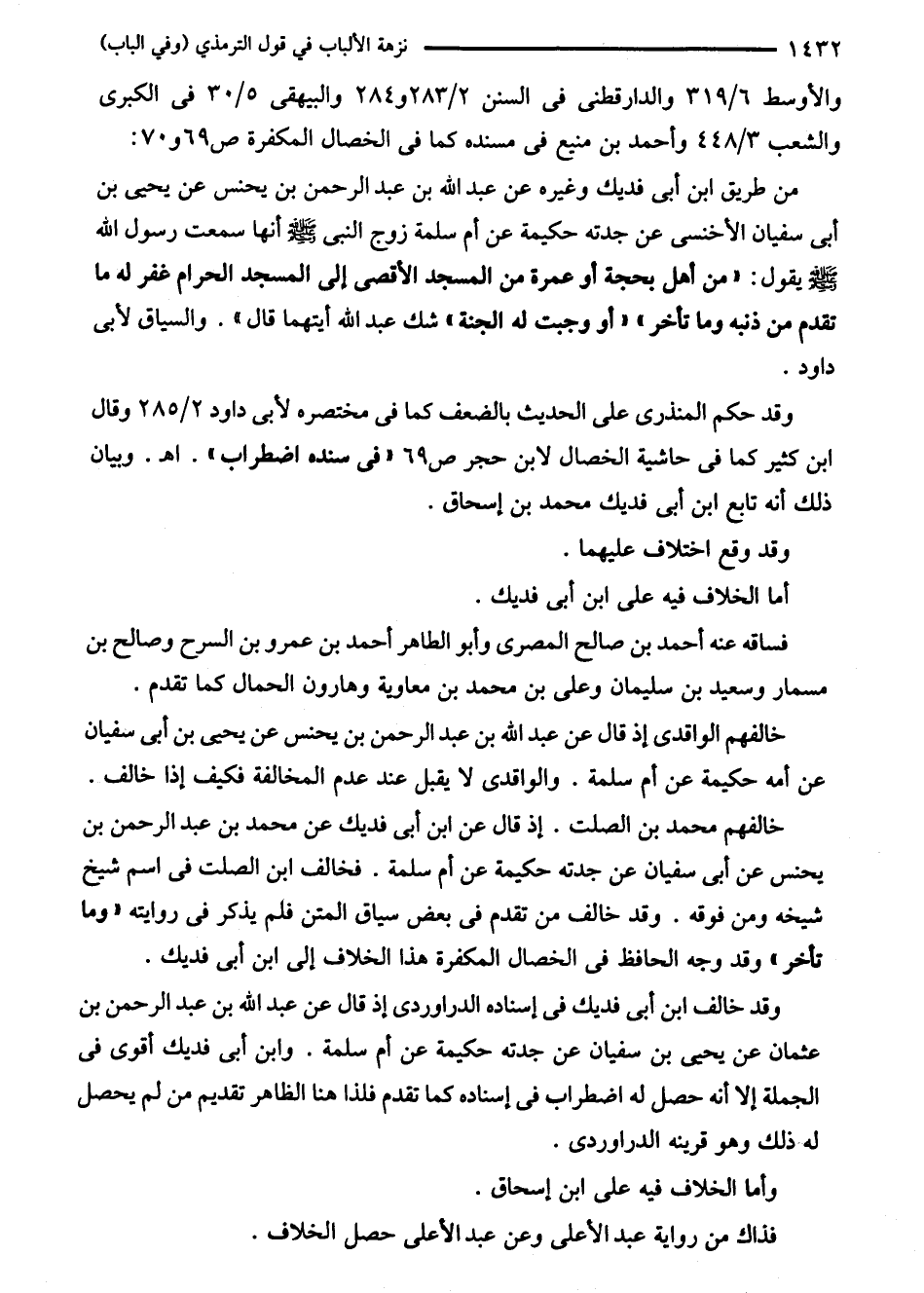 من طريق ابن أبى فديك وغيره عن عبد الله بن عبد الرحمن بن يحنس عن يحيى بن أبى سفيان الأخنسى عن جدته حكيمة عن أم سلمة زوج النبي - صلى الله عليه وسلم - أنها سمعت رسول الله - صلى الله عليه وسلم - يقول: "من أهل بحجة أو عمرة من المسجد الأقصى إلى المسجد الحرام غفر له ما تقدم من ذنبه وما تأخر، "أو وجبت له الجنة، شك عبد الله أيتهما قال". والسياق لأبى داود.
