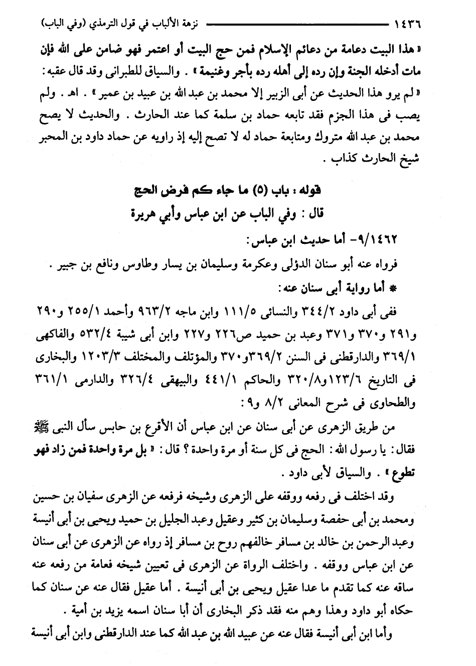 من طريق الزهرى عن أبى سنان عن ابن عباس أن الأقرع بن حابس سأل النبي - صلى الله عليه وسلم - فقال: يا رسول الله: الحج في كل سنة أو مرة واحدة؟ قال: "بل مرة واحدة فمن زاد فهو تطوع". والسياق لأبى داود.