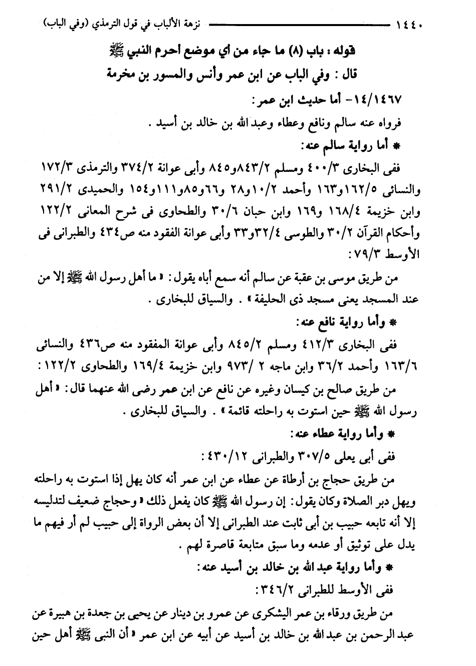من طريق ورقاء بن عمر اليشكرى عن عمرو بن دينار عن يحيى بن جعدة بن هبيرة عن عبد الرحمن بن عبد الله بن خالد بن أسيد عن أبيه عن ابن عمر "أن النبي - صلى الله عليه وسلم - أهل حين