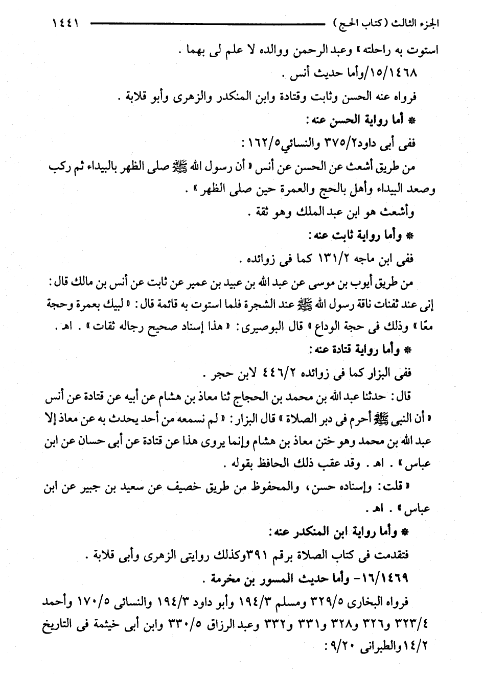 قال: حدثنا عبد الله بن محمد بن الحجاج ثنا معاذ بن هشام عن أبيه عن قتادة عن أنس "أن النبي - صلى الله عليه وسلم - أحرم في دبر الصلاة" قال البزار: "لم نسمعه من أحد يحدث به عن معاذ إلا عبد الله بن محمد وهو ختن معاذ بن هشام وإنما يروى هذا عن قتادة عن أبى حسان عن ابن عباس". اهـ. وقد عقب ذلك الحافظ بقوله.
