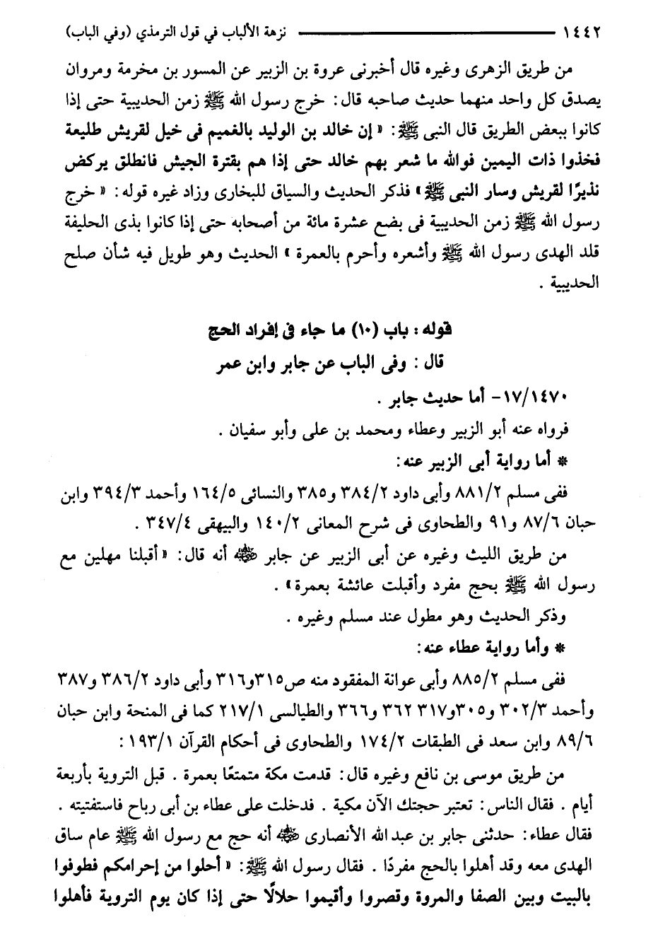 من طريق الليث وغيره عن أبى الزبير عن جابر - رضي الله عنه - أنه قال: "أقبلنا مهلين مع رسول الله - صلى الله عليه وسلم - بحج مفرد وأقبلت عائشة بعمرة".