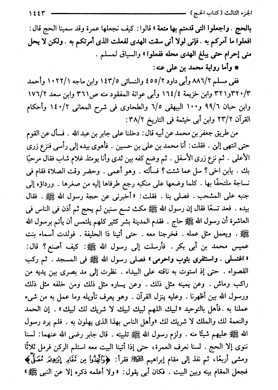من طريق جعفر بن محمد عن أبيه قال: دخلنا على جابر بن عبد الله. فسأل عن القوم حتى انتهى إلىّ. فقلت: أنا محمد بن على بن حسين. فأهوى بيده إلى رأسى فنزع زرى الأعلى. ثم نزع زرى الأسفل. ثم وضع كفه بين ثدى وأنا يومئذ غلام شاب فقال مرحبًا بك. يابن اخى؟ سل عما شئت؟ فسألته. وهو أعمى. وحضر وقت الصلاة فقام في نساجة ملتحفًا بها. كلما وضعها على منكبه رجع طرفاها إليه من صغرها. ورداؤه إلى جنبه على المشحب. فصلى بنا. فقلت: "أخبرنى عن حجة رسول الله - صلى الله عليه وسلم -. فقال بيده. فعد تسعًا فقال إن رسول الله - صلى الله عليه وسلم - مكث تسع سنين لم يحج ثم أذن في الناس في العاشرة أن رسول الله - صلى الله عليه وسلم - حاج. فقدم المدينة بشر كثير كلهم يلتمس أن يأتم برسول الله - صلى الله عليه وسلم -. ويعمل مثل عمله. فخرجنا معه. حتى أتينا ذا الحليفة. فولدت أسماء بنت عميس محمد بن أبى بكر. فأرسلت إلى رسول الله - صلى الله عليه وسلم -: كيف أصنع؟ قال: "اغتسلى. واستثفرى بثوب واحرمى" فصلى رسول الله - صلى الله عليه وسلم - في المسجد. ثم ركب القصواء. حتى إذ استوت به ناقته على البيداء. نظرت إلى مد بصرى بين يديه من راكب وماش. وعن يمينه مثل ذلك. وعن يساره مثل ذلك ومن خلفه مثل ذلك ورسول الله بين أظهرنا. وعليه ينزل القرآن. وهو يعرف تأويله وما عمل به من شىء عملنا به. فأهل بالتوحيد "لبيك اللهم لبيك لبيك لا شريك لك لبيك". إن الحمد والنعمة لك والملك لا شريك لك "وأهل الناس بهذا الذى يهلون به. فلم يرد رسول الله - صلى الله عليه وسلم - عليهم شيئًا منه. ولزم رسول الله - صلى الله عليه وسلم - تلبيته. قال جابر رضى الله عنهما: لسنا ننوى إلا الحج. لسنا نعرف العمرة، حتى إذا أتينا البيت معه استلم الركن فرمل ثلاثًا ومشى أربعًا، ثم نفذ إلى مقام إبراهيم - عليه السلام - فقرأ: {وَاتَّخِذُوا مِنْ مَقَامِ إِبْرَاهِيمَ مُصَلًّى} فجعل المقام بينه وبين البيت. فكان أبى يقول: "ولا أعلمه ذكره إلا عن النبي - صلى الله عليه وسلم -"